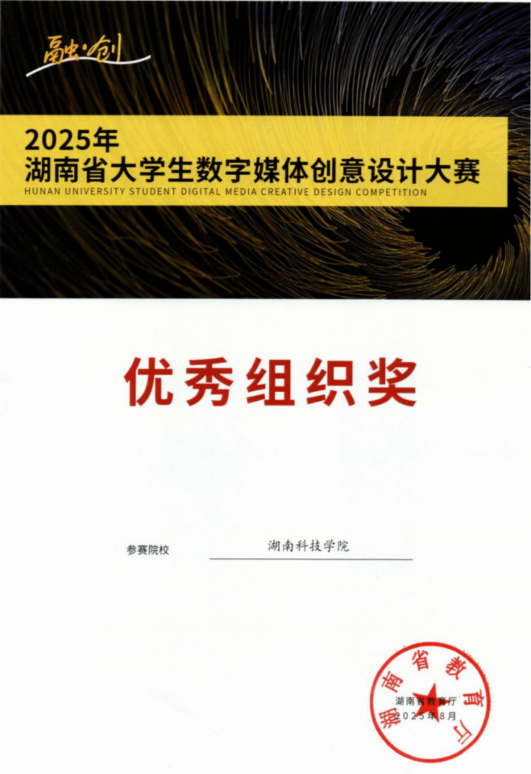 据悉,湖南省大学生数字媒体创意设计大赛由湖南省教育厅主办,是省内数字创意领域的标杆赛事。本届赛事由长沙理工大学承办,共收到全省32所高校推荐的3145件参赛作品,竞争尤为激烈。此次成绩的取得体现了该学院在教学改革和创新人才培养方面取得的显著成效。