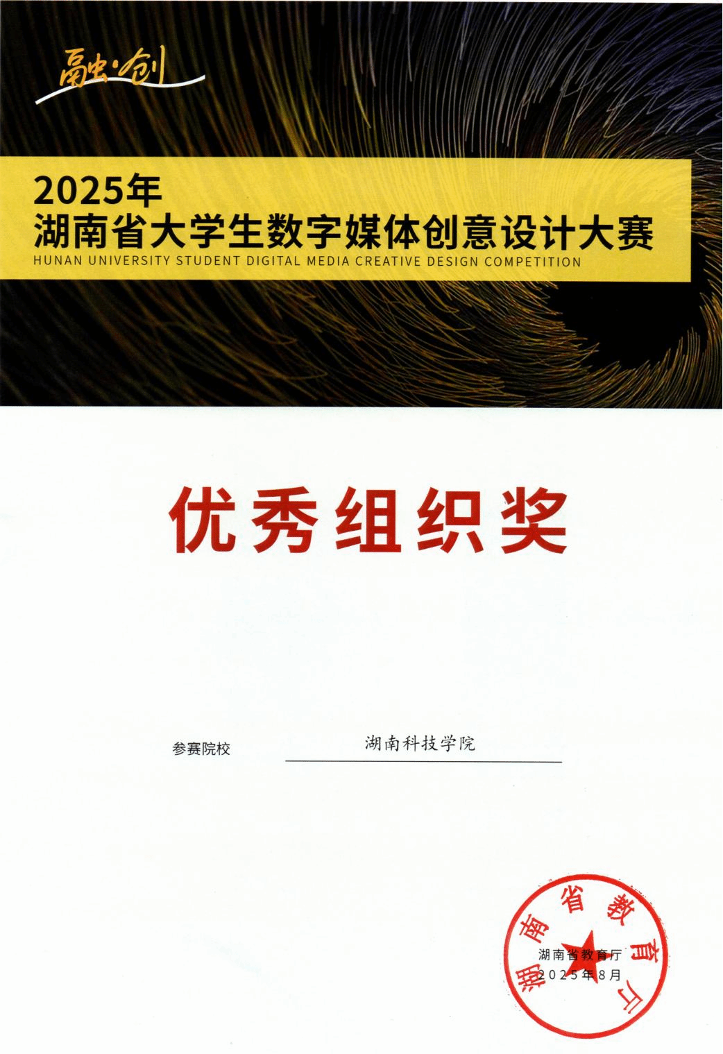 本网讯(通讯员 付星星)近日,2025年湖南省大学生数字媒体创意设计大赛获奖名单正式公布。我校美术与艺术设计学院师生凭借扎实的专业功底和卓越的创新能力,共斩获等级奖项49项,其中一等奖8项、二等奖13项、三等奖28项,获奖数量和质量均位居全省前列,并被授予“优秀组织奖”。