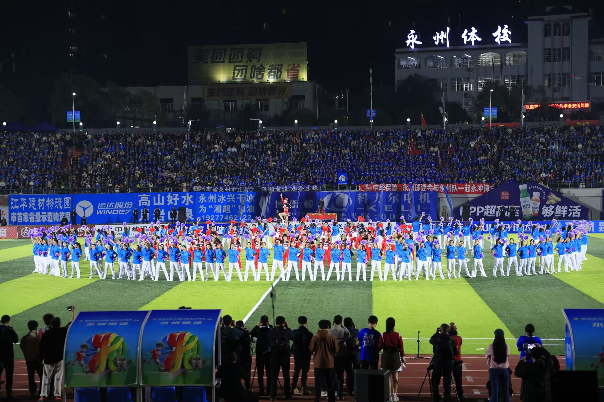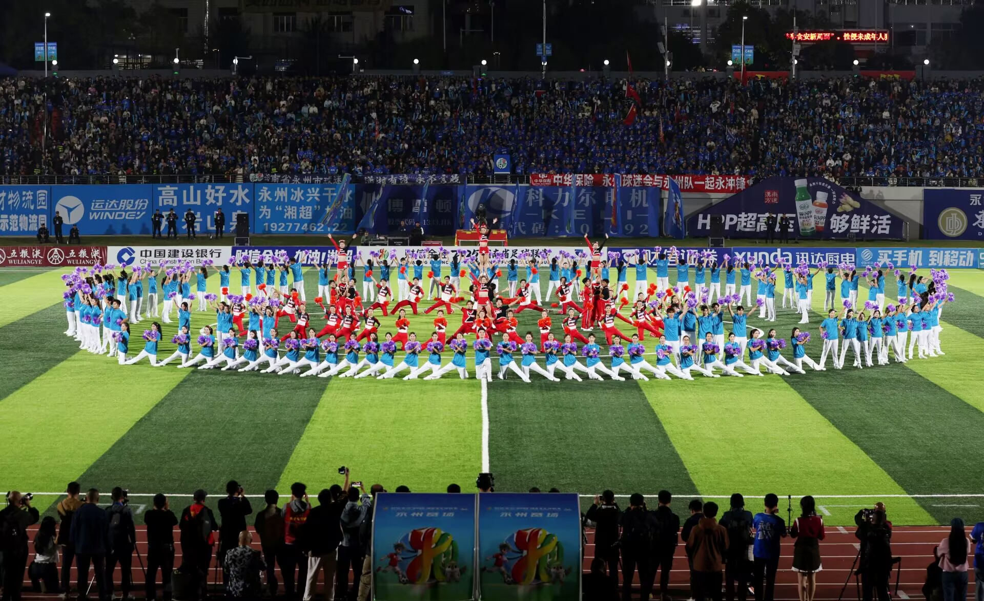 本网讯(通讯员:段然 万涛)10月26日晚,在“2025湘超足球联赛”(第七轮)永州主场对阵长沙的比赛中,美术与艺术设计学院李国碧与体育学院盘华、郑华艳三位老师共同指导的200名啦啦操队员,以一场融合艺术创意与体育精神的表演,为赛事注入美育力量。