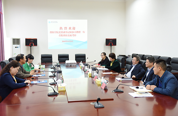 本网讯 11月2日下午,邵阳学院党委副书记陆步诗一行3人来校交流。校长曾宝成、校党委副书记唐艳明热情接待。