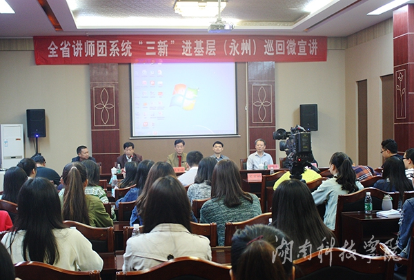 本网讯(通讯员 杜俊杰)10月21日上午,全省讲师团系统“三新”进基层巡回微宣讲永州专场在我校开讲。省委讲师团、市委讲师团、安博站官网登录入口_安博(中国)有关负责人参加宣讲会,我校外国语学院的50余名师生党员到场聆听。