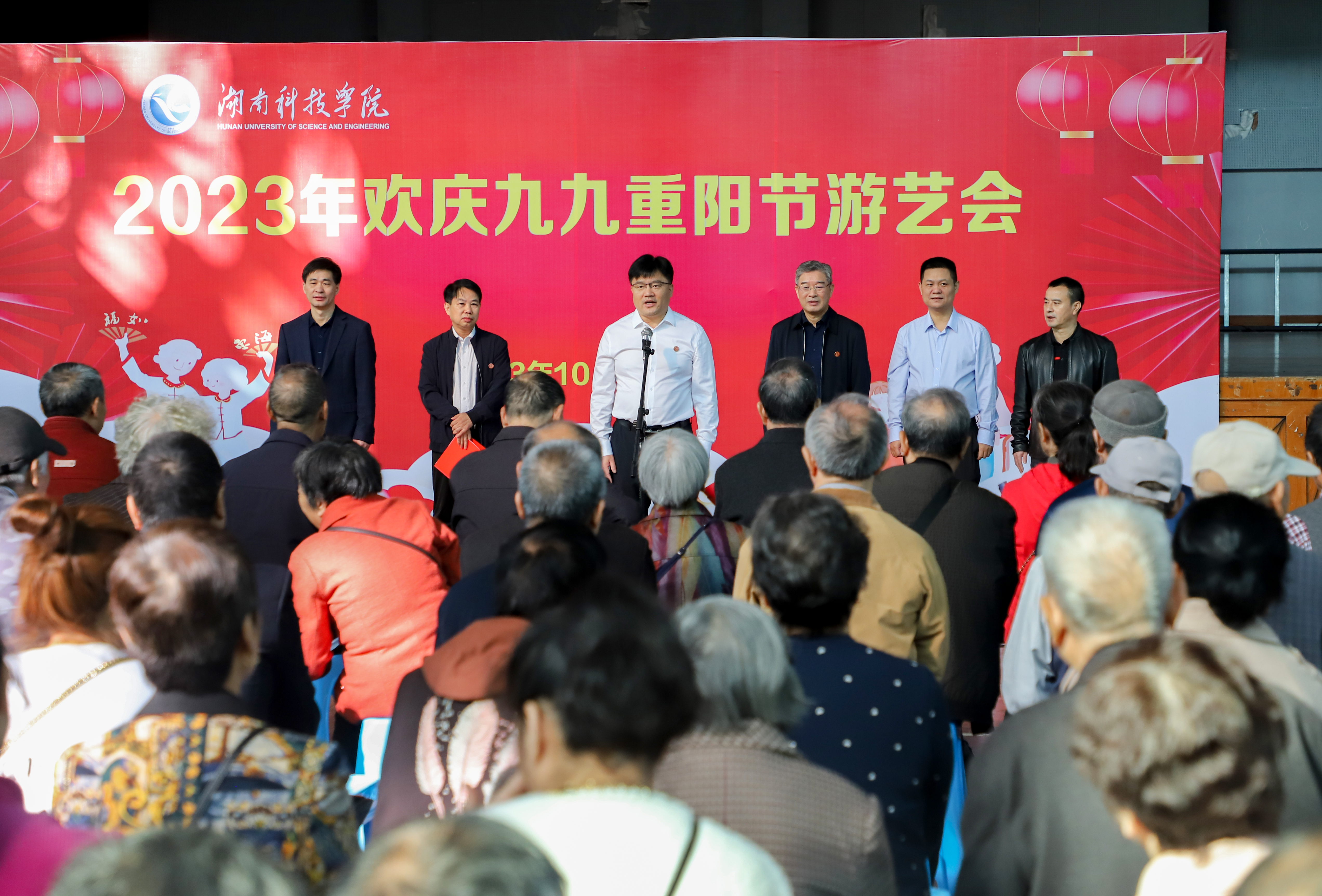 本网讯 菊暖花开踏秋归,重阳黍香酒初熟。10月23日,学校在体育馆举行2023年欢庆九九重阳节游艺会。党委书记李钢,党委副书记宋宏福,副校长李常健来到活动现场,为老同志们送上诚挚的祝福。
