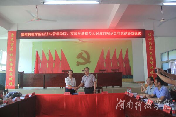 该院与双牌县塘底乡政府签订了合作共建合约。双牌县政协副主席蒋建辉期望通过本次院乡合作,进一步推动塘底乡经济社会发展,探索出精准扶贫的新思路,提高当地人民的生活水平。该院院长李清泉与塘底乡乡长蒋黎芳共同为“院乡合作共建示范基地”和“安博站官网登录入口_安博(中国)经济与管理学院大学生三下乡示范基地”揭牌。