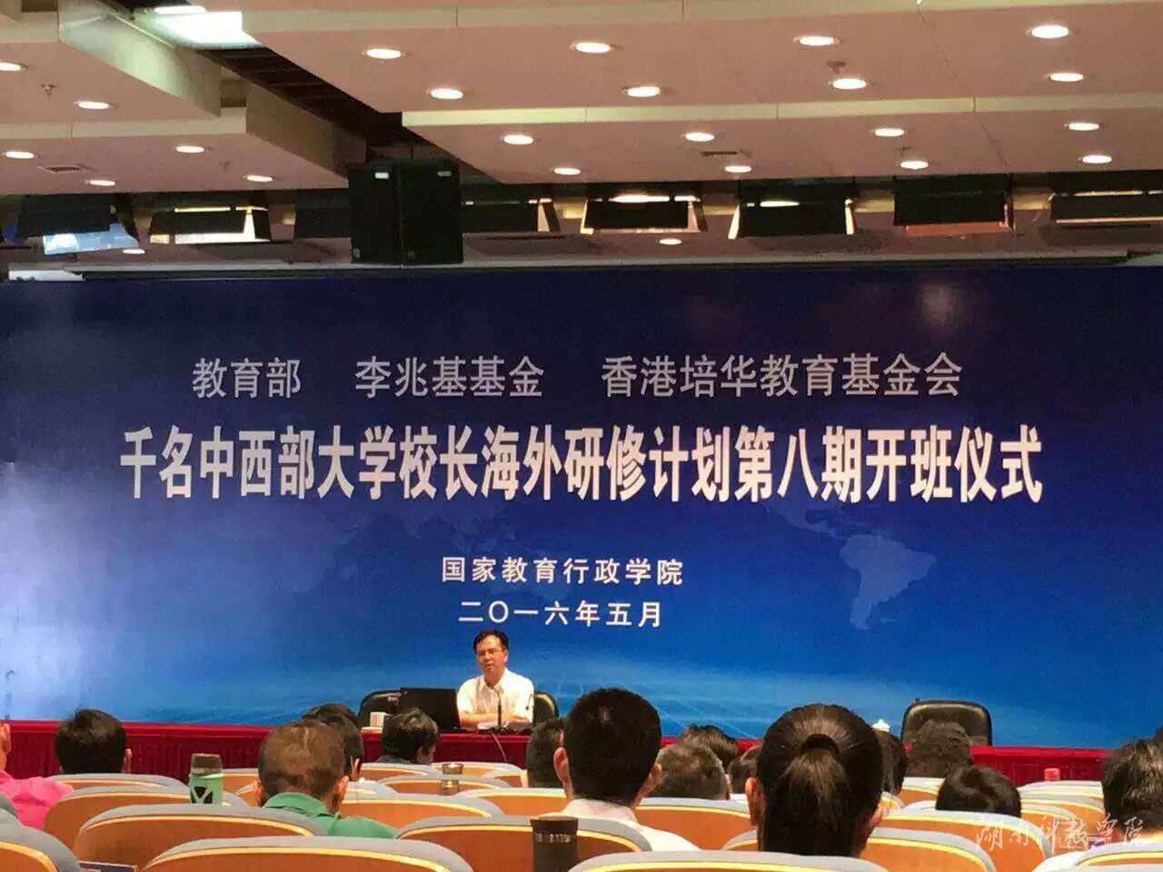 本网讯 5月18日上午,应国家教育行政学院邀请,校党委书记陈弘在“千名中西部大学校长海外研修计划”培训班上畅谈“创新和坚守:地方高校领导的使命与作为”。结合学校办学实际,陈弘与来自全国各地的100多名大学领导交流了关于地方高校发展的理论思考与实践经验。