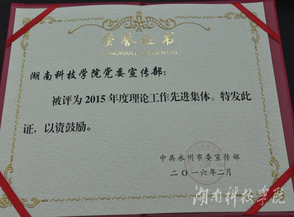 本网讯 中共永州市委宣传部下发《关于表彰2015年度理论工作先进集体和先进个人的决定》(永宣办〔2016〕2号),我校党委宣传部被评为先进集体。全市共评选出6个理论工作先进集体。