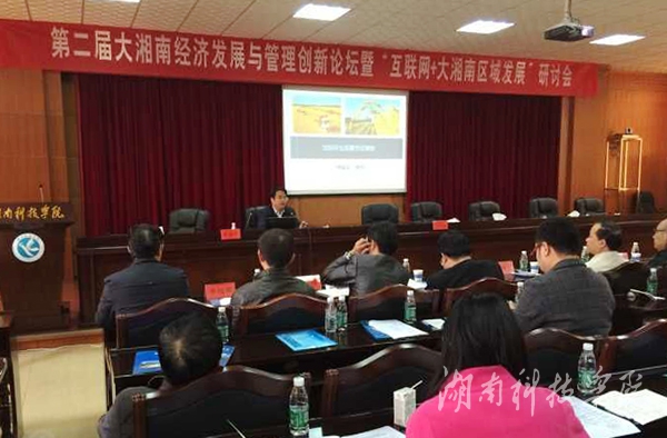 本网讯(记者 裴滢 实习记者 刘梦雅 张云芳 邓肖华 肖浪 尹文怡)11月14日,第二届大湘南经济发展与管理创新论坛暨“互联网+大湘南区域发展”研讨会在我校举行。校党委书记陈弘出席并致辞,副校长宋宏福主持。共有来自各高校30余名专家学者及企业家代表参加研讨。