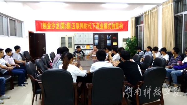 本网讯 (通讯员 彭丰香) 9月22日晚,就业创业指导中心在行政办公楼105室举办以“互联网时代下商业模式的重构”为主题的创业沙龙。乐易考(湖南)教育科技有限公司CEO安光吉应邀为我校学生讲授大数据时代下的互联网创业经验。