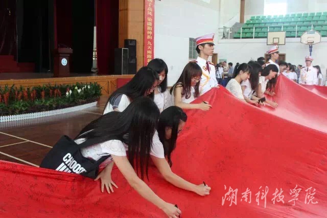 本网讯(记者 黄丽丽 实习记者 王翩翩)6月12日下午,学校举行纪念抗日战争暨世界反法西斯战争胜利70周年湖南高校百万师生巡回签名活动。副校长程智开出席,相关部门负责人及全校600余名师生代表参加活动。