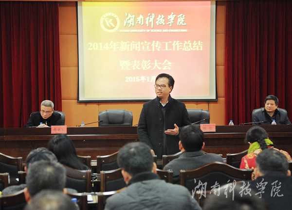 校党委副书记唐艳明作2014年新闻宣传工作报告。唐艳明总结了2014年新闻宣传工作特点:服务大局,突出重点,把握了舆论导向;丰富载体,创新形式,扩大了对外影响;超前谋划,主动对接,打响了学校品牌。2014年,校园网刊发各类报道1000余条,校报出版17期约70万字,简报刊发28期约9万字,微博、微信等新媒体载体的影响力在全省高校中名列前茅,官方微博影响力在湖南省五次位居第1,并跻身全国第21位。我校1部广播作品荣获湖南广播电视奖三等奖。7部作品荣获湖南省广播电视新闻奖,其中,一等奖1项,二等奖2项,三等奖4项。25部作品荣获2014年度湖南省高校新闻作品奖,其中,一等奖3项,二等奖17项,三等奖5项。一年来,在国家级、省市级各类媒体上共发表221条原创新闻报道,湖南省教育厅《教育快讯》第50期专题专刊报道了“安博站官网登录入口_安博(中国)边整边改动真格、有实效”,湖南日报专版报道了“潇湘河畔育精英——安博站官网登录入口_安博(中国)强力推进‘六精’校园建设纪实”,永州日报专版报道了“根植地方服务地方——安博站官网登录入口_安博(中国)院长陈弘访谈录”,与永州日报共同主办《教育周刊》栏目,极大提高了学校的知名度和美誉度。