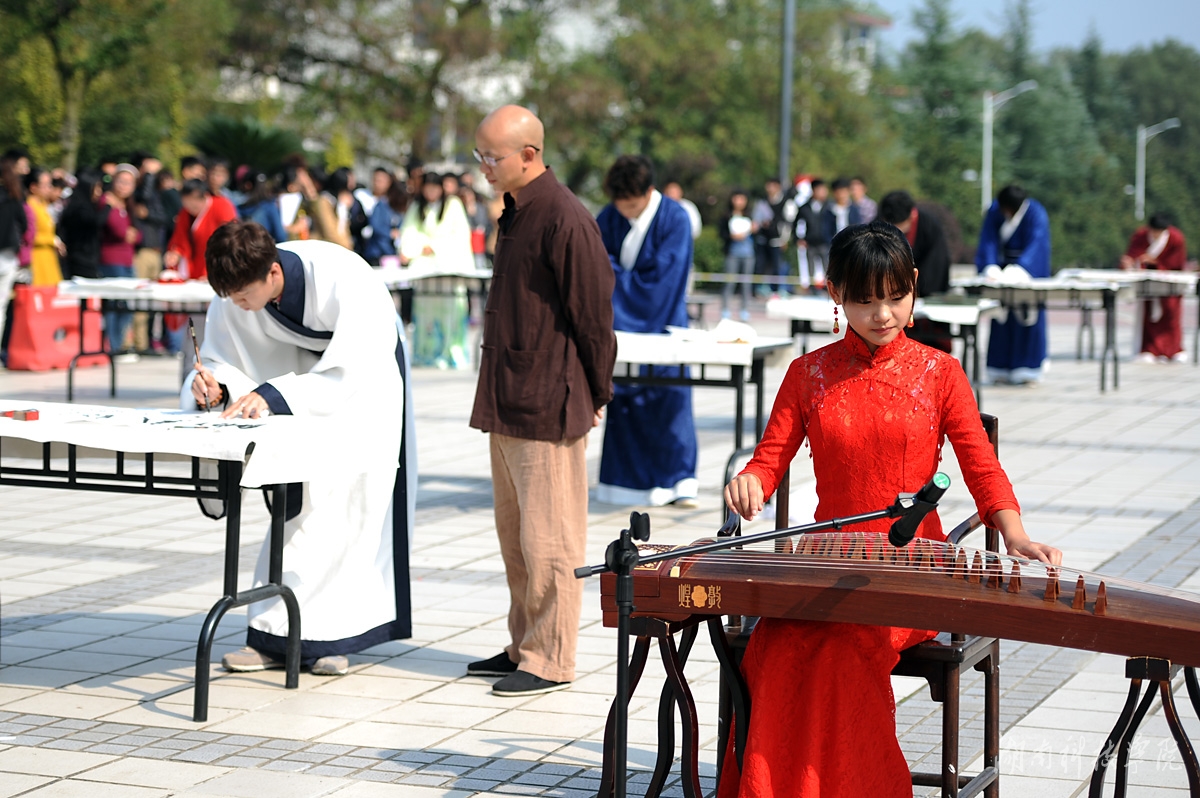 本网讯 (记者李瑛 摄影 何帅文 李国家) 枫红寒露染潇湘,琴醉茶道翰墨香。11月14日,我校近千名师生陶醉在悠扬婉转的古筝声中,闻着淡淡的茶香,欣赏了一场学子着汉服、民国服装现场挥毫泼墨的弘扬传统文化的视觉盛宴。