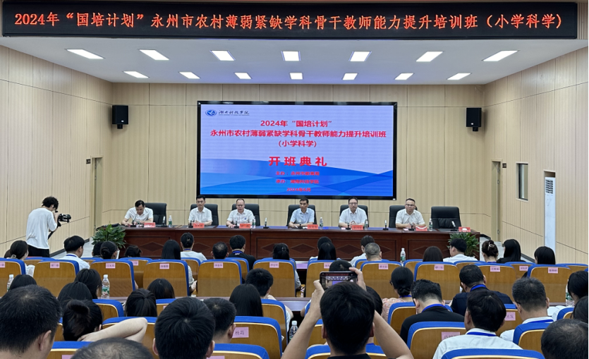 本网讯(通讯员 曹湖云 江鸿湖 唐卉婉)6月17日上午,2024年“国培计划”永州市农村薄弱紧缺学科骨干教师能力提升培训班(小学科学)在我校开班。党委委员、副校长何海,永州市教育局党组副书记、副局长张荣华,永州市教师发展中心主任唐作明,正高级教师、第十四届全国人大代表胡国柱,以及来自永州市各县区的80名小学科学教师参加了开班典礼。