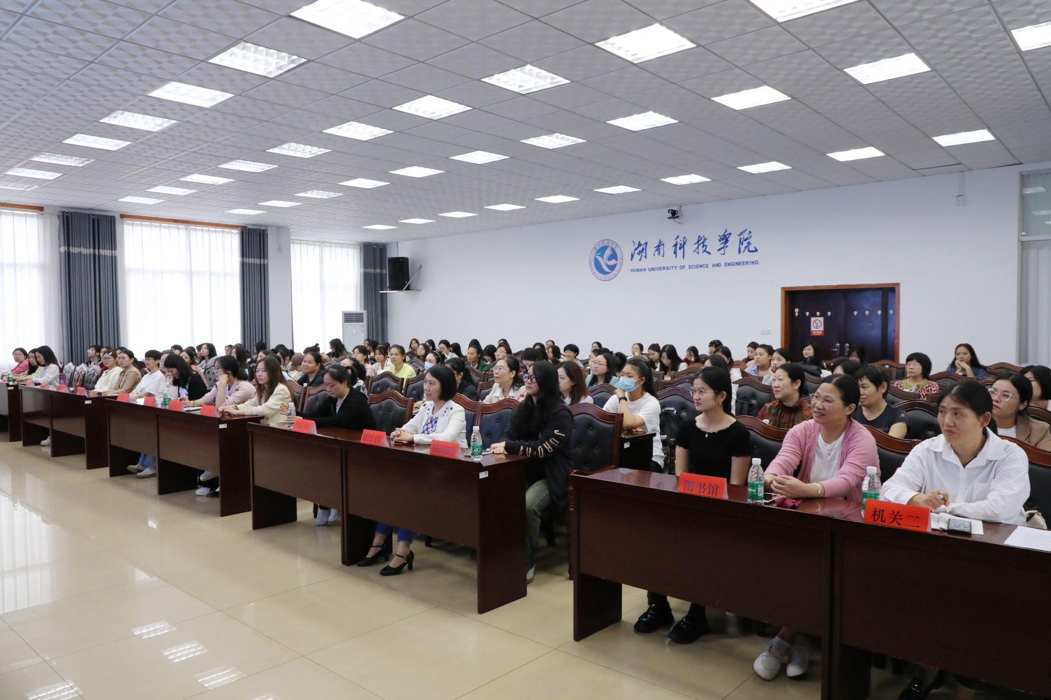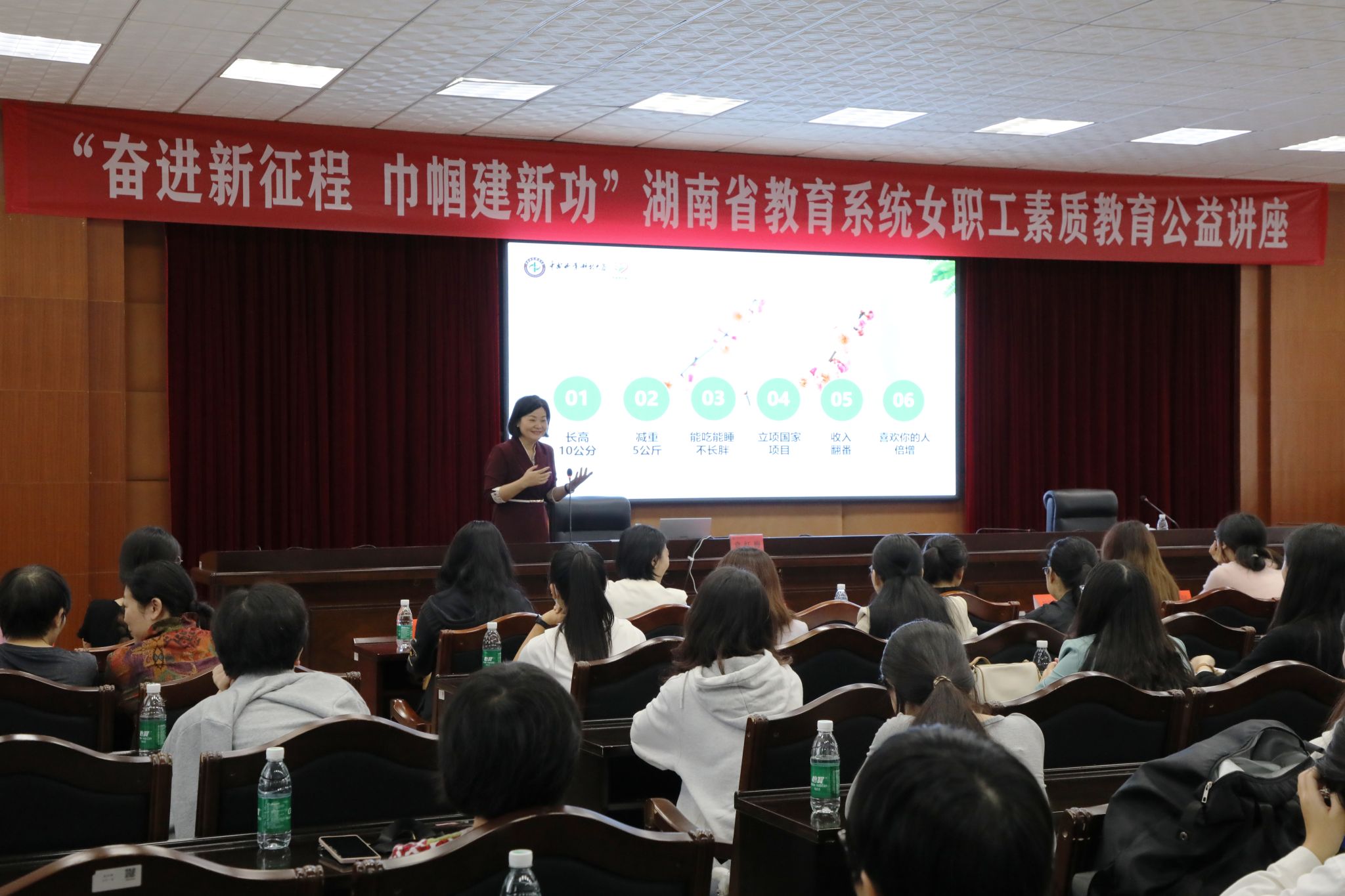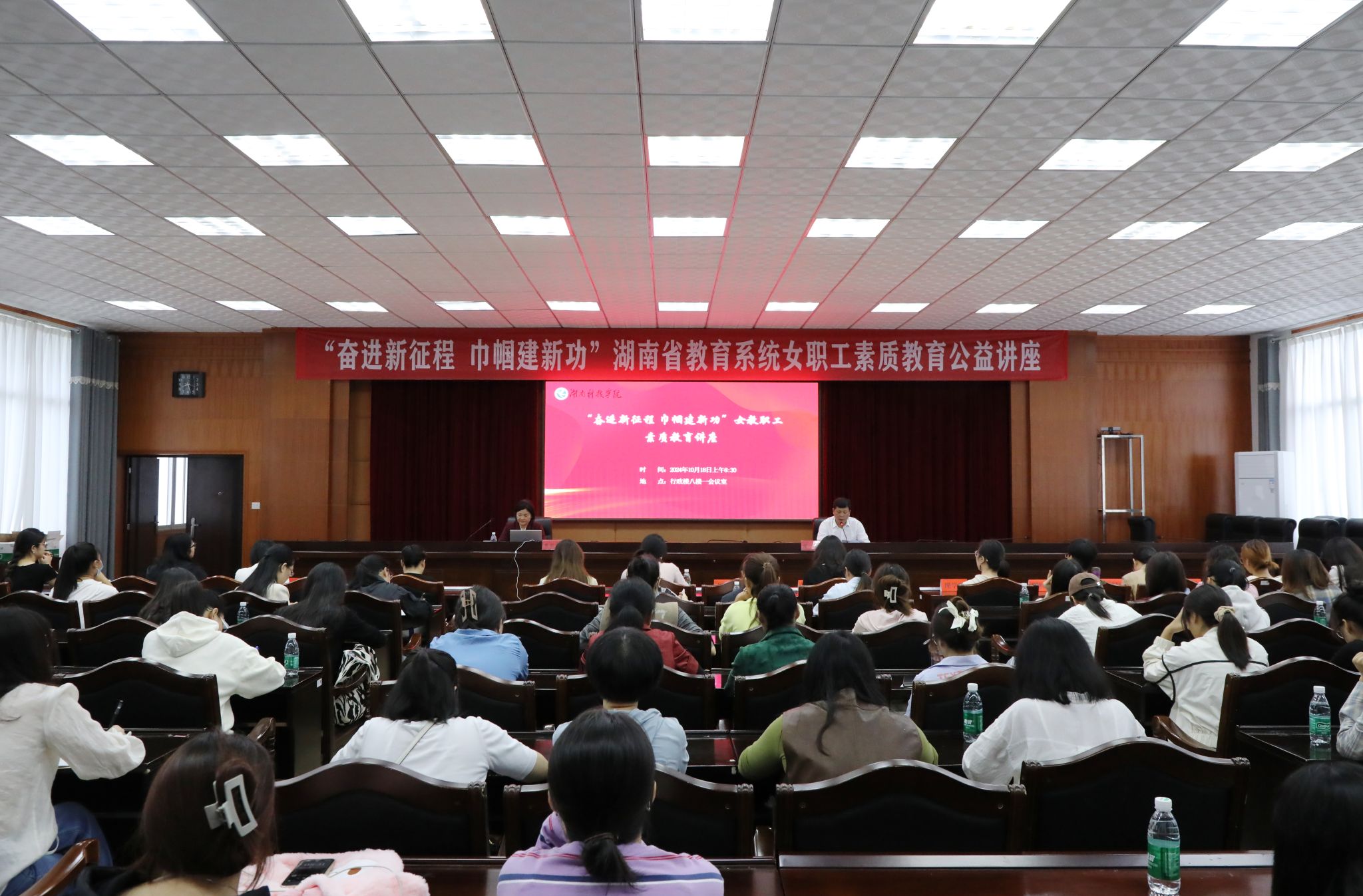 本网讯(记者 汤梦洁 摄影 谢志豪)10月18日,学校举行“奋进新征程,巾帼建新功”女职工素质教育讲座。优秀校友、党的二十大代表、中南林业科技大学袁红梅教授应邀来校作专题讲座,讲座由校工会常务副主席谢一民主持,工会全体工作人员及100余名女教职工代表参加讲座。
