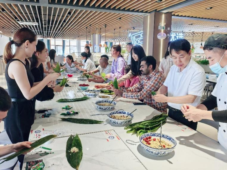 糯米、粽叶、红枣、咸蛋黄等食材一字排开,外籍师生们在志愿者的帮助下,卷粽叶、填糯米、系棉线,虽然手法略显生疏,但现场欢声笑语不断。最终,一个个形态各异的粽子在手中诞生,来自泰国的留学生天瑜骄傲地展示自己的作品,“这是我第一次包粽子,在活动中我体验了中国传统文化的独特魅力,也感受到家的温暖!”来自巴基斯坦的阿萨德博士和萨娜博士夫妇也表示:“这样的活动不仅让我们更了解中国,更让我们在异国他乡找到了归属感。”