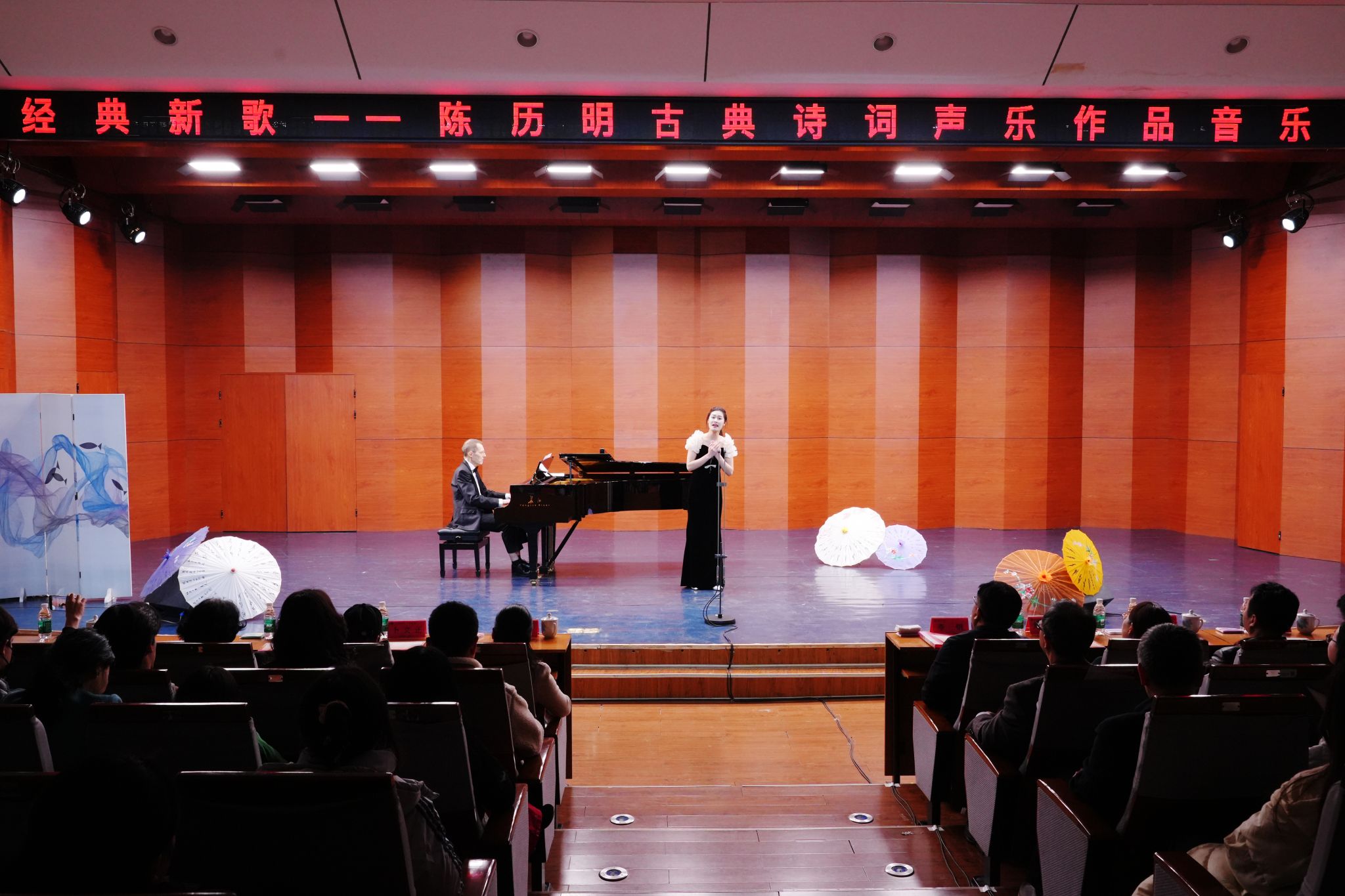本网讯(记者 向薛峰 摄影 谢志豪)“出淤泥而不染,濯清涟而不妖……”当周敦颐《爱莲说》的清廉之音,不再拘泥于课本,而是被青年学子唱响,让跨越时空的廉洁品质变得可听可感。12月16日晚,学校成功举办“经典新歌——陈历明古典诗词声乐作品音乐会”,为师生们打造了一堂“声”临其境的音乐思政课,让千年文脉“活”起来。校党委书记李钢,校党委委员、纪委书记陈灿军,副校长郑银芳,永州市文联党组书记、主席唐俊等出席音乐会。