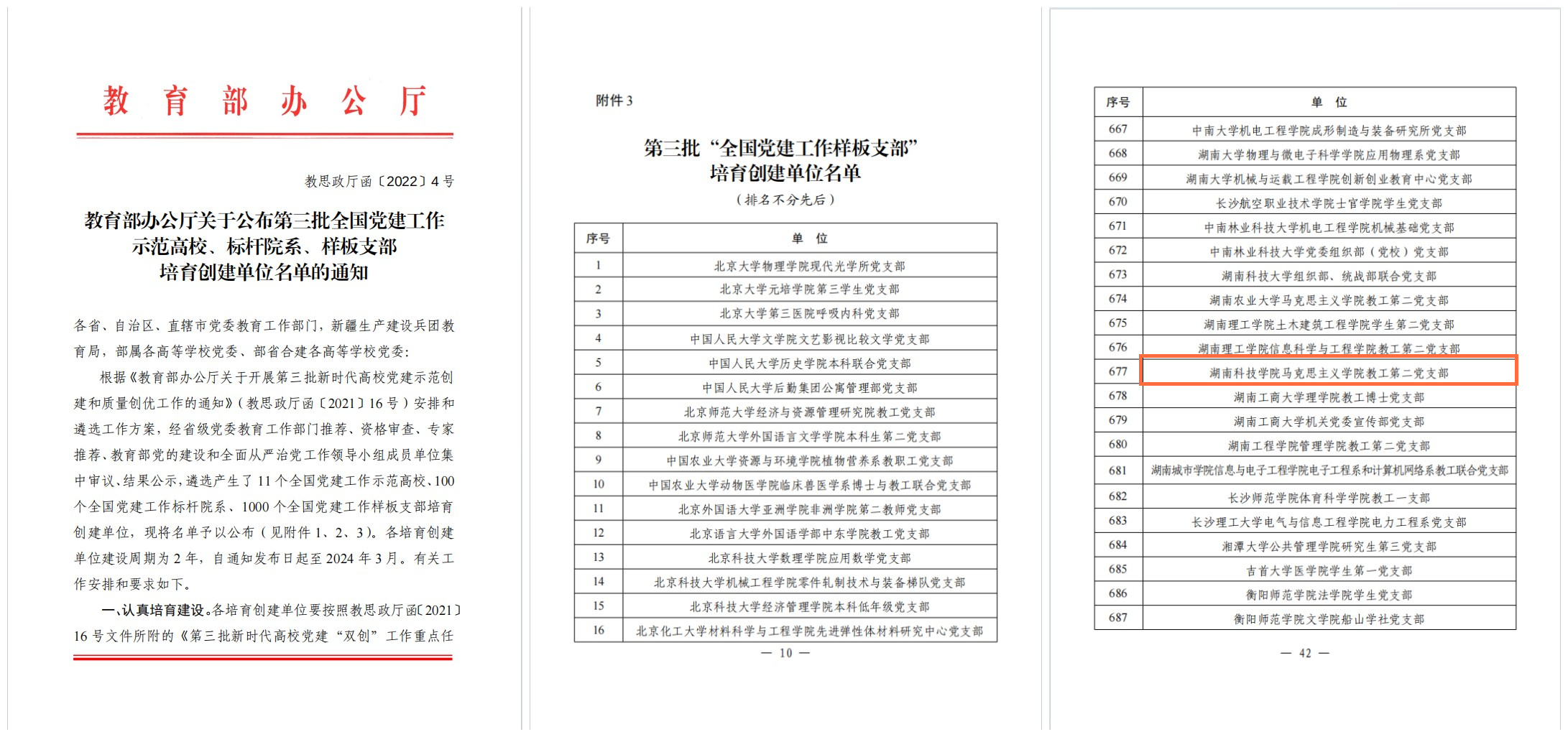 推进“时代新人铸魂工程”,组织师生赴李达故居、陈树湘烈士纪念园等红色教育基地开展研学,打造“行走的思政课”等党建品牌,获批全国大学生“延安精神”“井冈山精神”志愿宣讲服务团2个,荣获湖南省大学生党史知识竞赛团队一等奖、湖南省大学生思政课研究性学习成果展示竞赛特等奖、湖南省高校“青春学习堂”短视频大赛特等奖等多项荣誉。