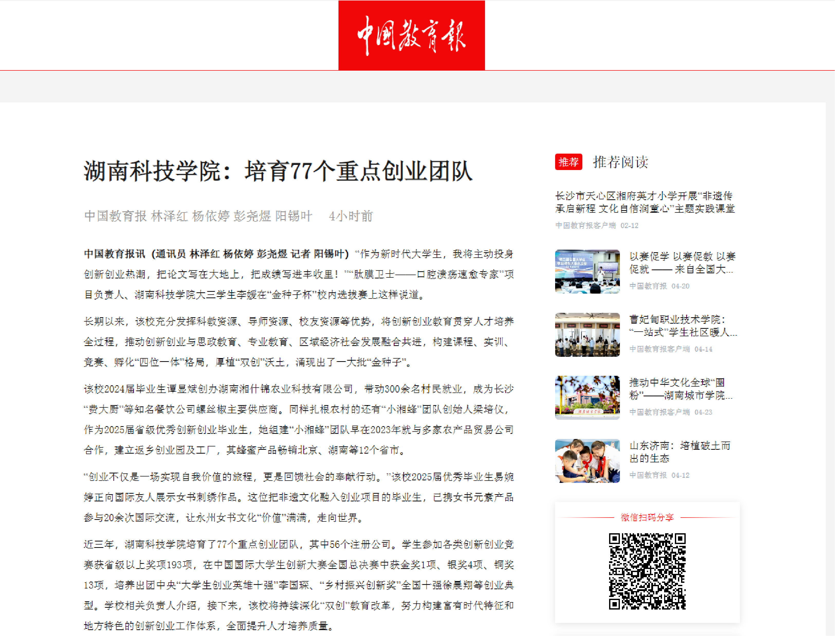 2025年,学校入选省支持大学生创业18所重点高校之一,“潇湘启航”大学生创业指导工作室被认定为2025年度湖南省大学生创业指导工作室,“永州创新创业一体化服务平台”获省发改委200万元专项支持。