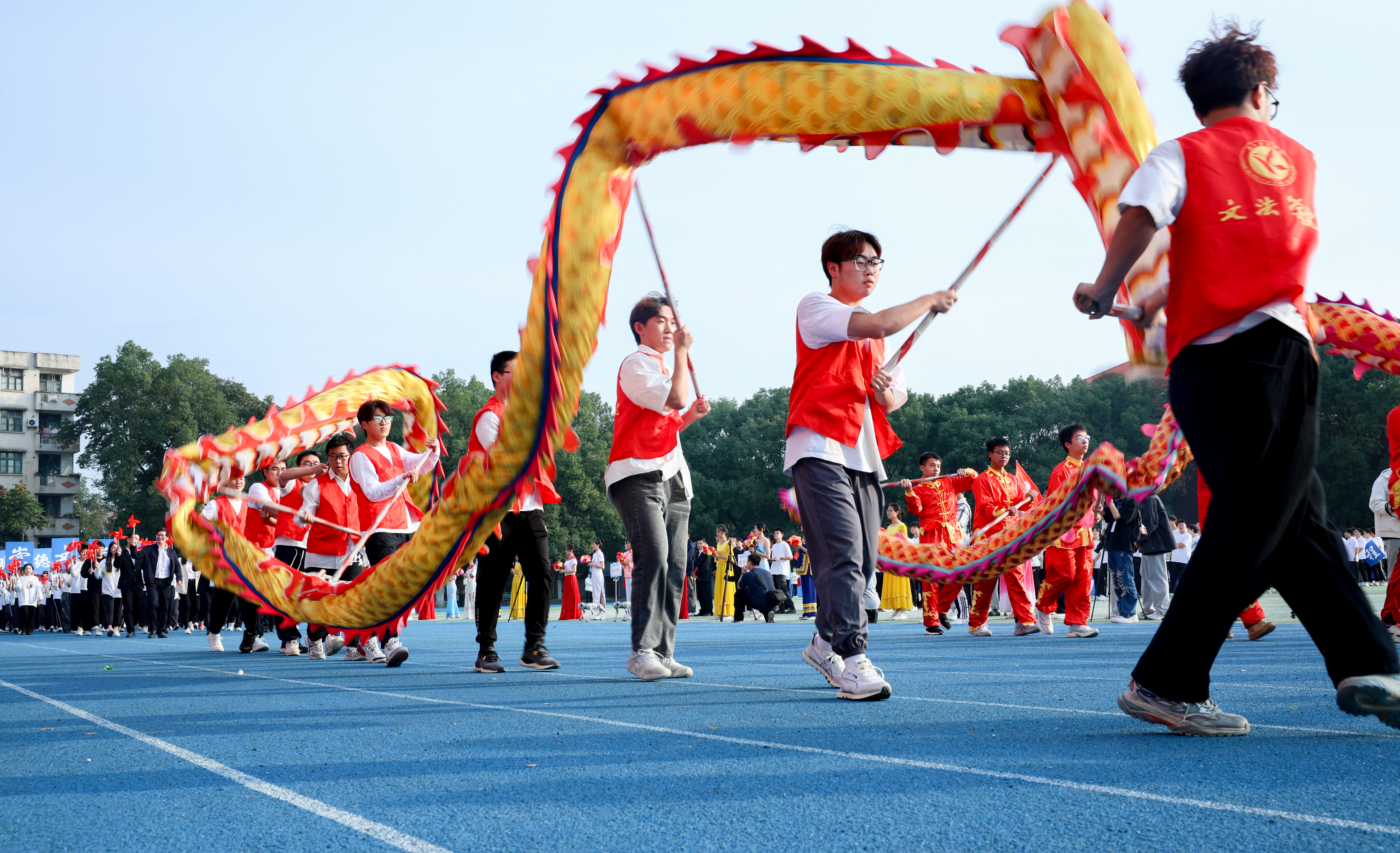 五颜六色的气球放飞天空,全场掌声雷动。在观众热情的欢呼声中,美术与艺术设计学院学生带来了啦啦操表演《美丽中国》,体育学院学生展示了行云流水的舞刀表演和摆字方阵表演,精彩纷呈,创意十足,演绎了健康向上的体育精神。