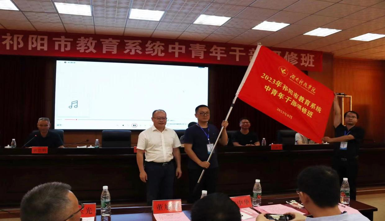 本网讯(通讯员 邹小阳 綦艳)8月8日,2023年祁阳市教育系统中青年干部研修班在我校开班。校党委委员、副校长何海出席开班典礼并向学员授旗。祁阳市人民政府党组成员、副市长周贞霖出席开班仪式并作动员讲话。开班典礼由祁阳市教育局党组书记、局长黄恩鹏主持。