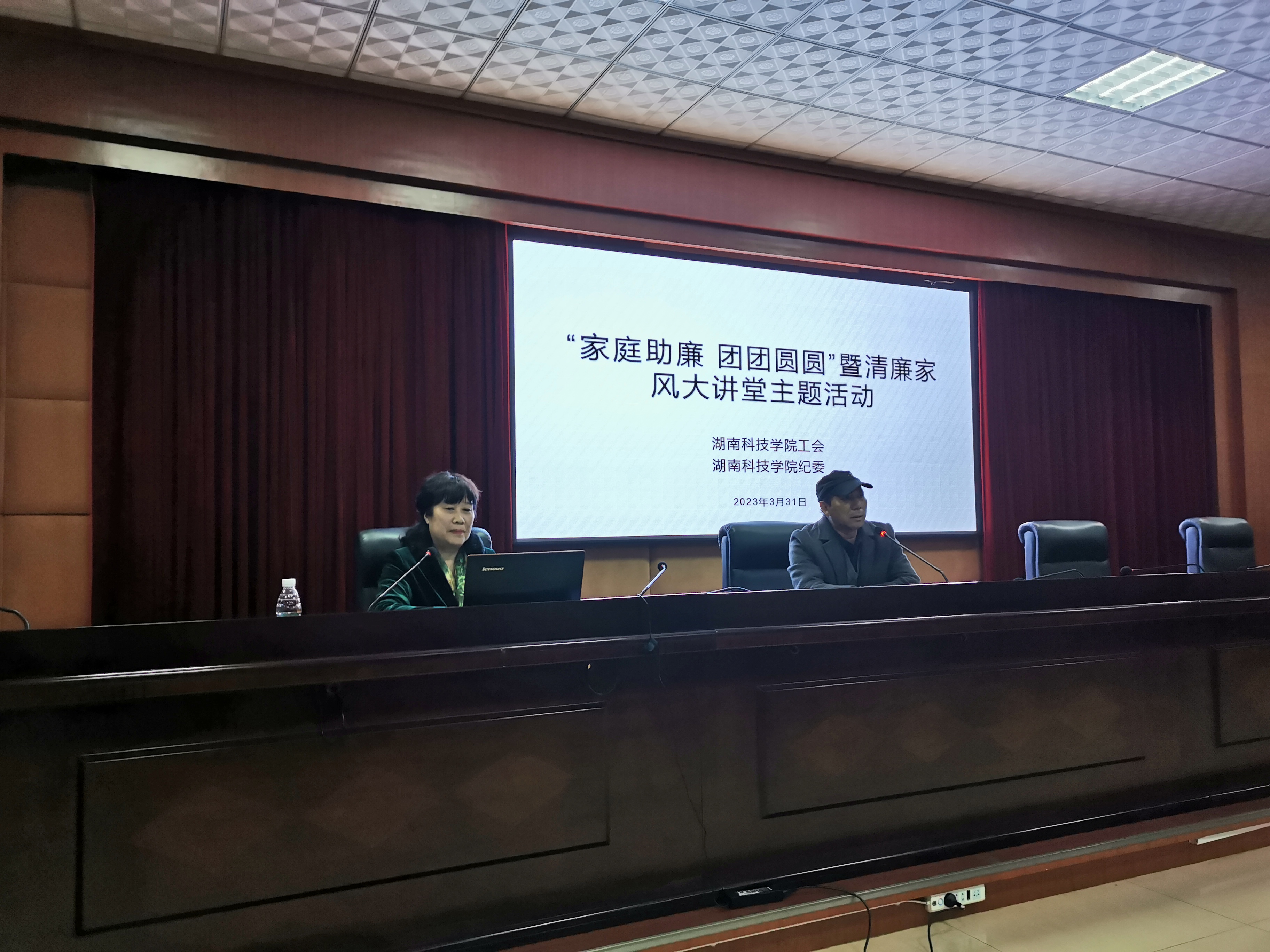 本网讯(通讯员  覃小明)3月31日晚,学校工会、纪委联合举行“家庭助廉 团团圆圆” 暨清廉家风大讲堂主题活动,全校处级领导干部配偶60余人参加。活动邀请学校党委组织部原部长卢桂珍教授担任主讲人,工会常务副主席潘剑锋主持活动。
