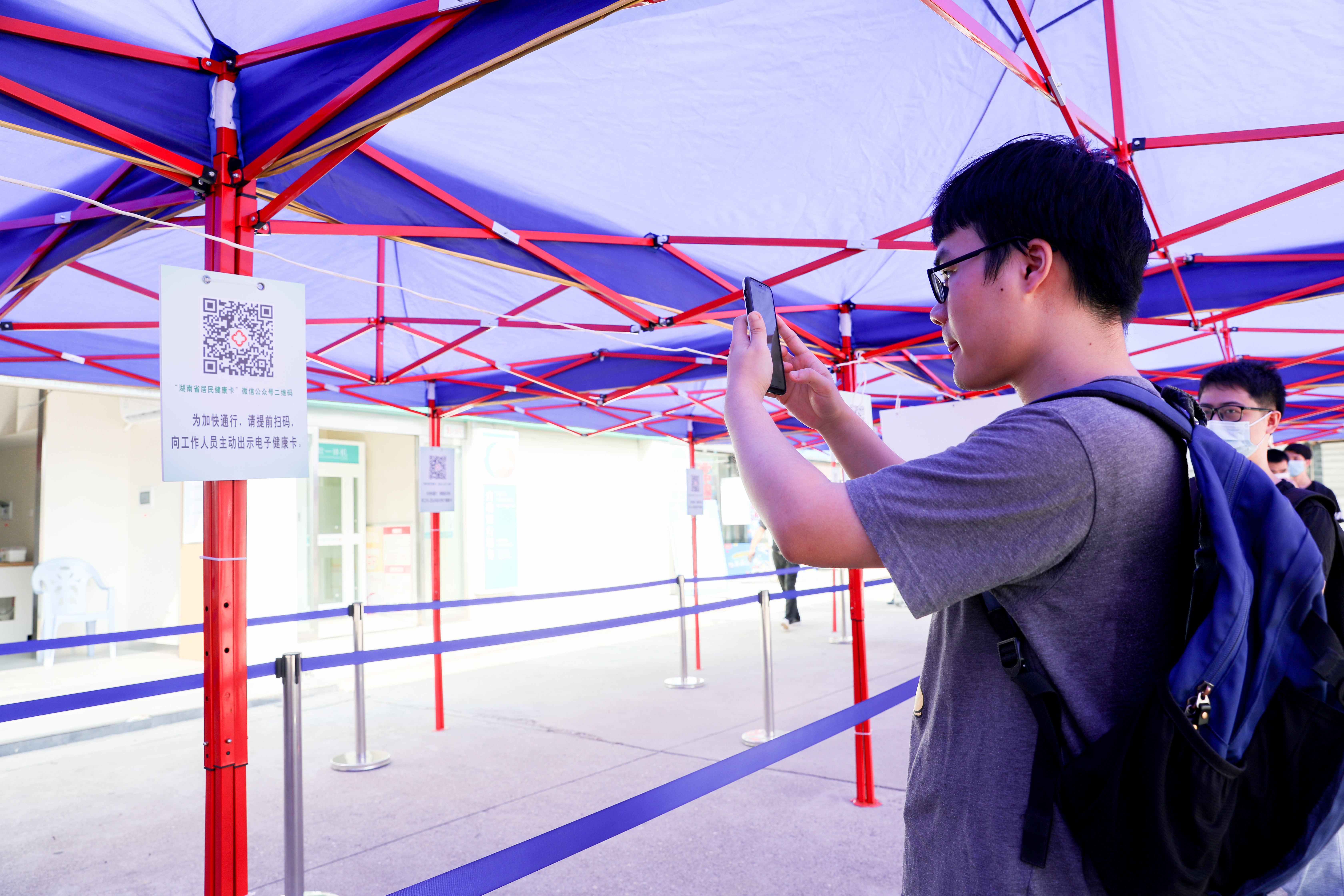 演练中,返校学生佩戴口罩按指示标识排队等候进校,每人间隔1.5米。经值班辅导员引导到“入校通道”,接受健康码核验,显示为绿色且无中高风险地区旅居史的学生,即可至东大门体温监测区进行体温检测,体温正常者可有序进校。如中高风险地区旅居史的学生,还需出示开学前7天内的核酸检测健康报告或相关的健康材料。