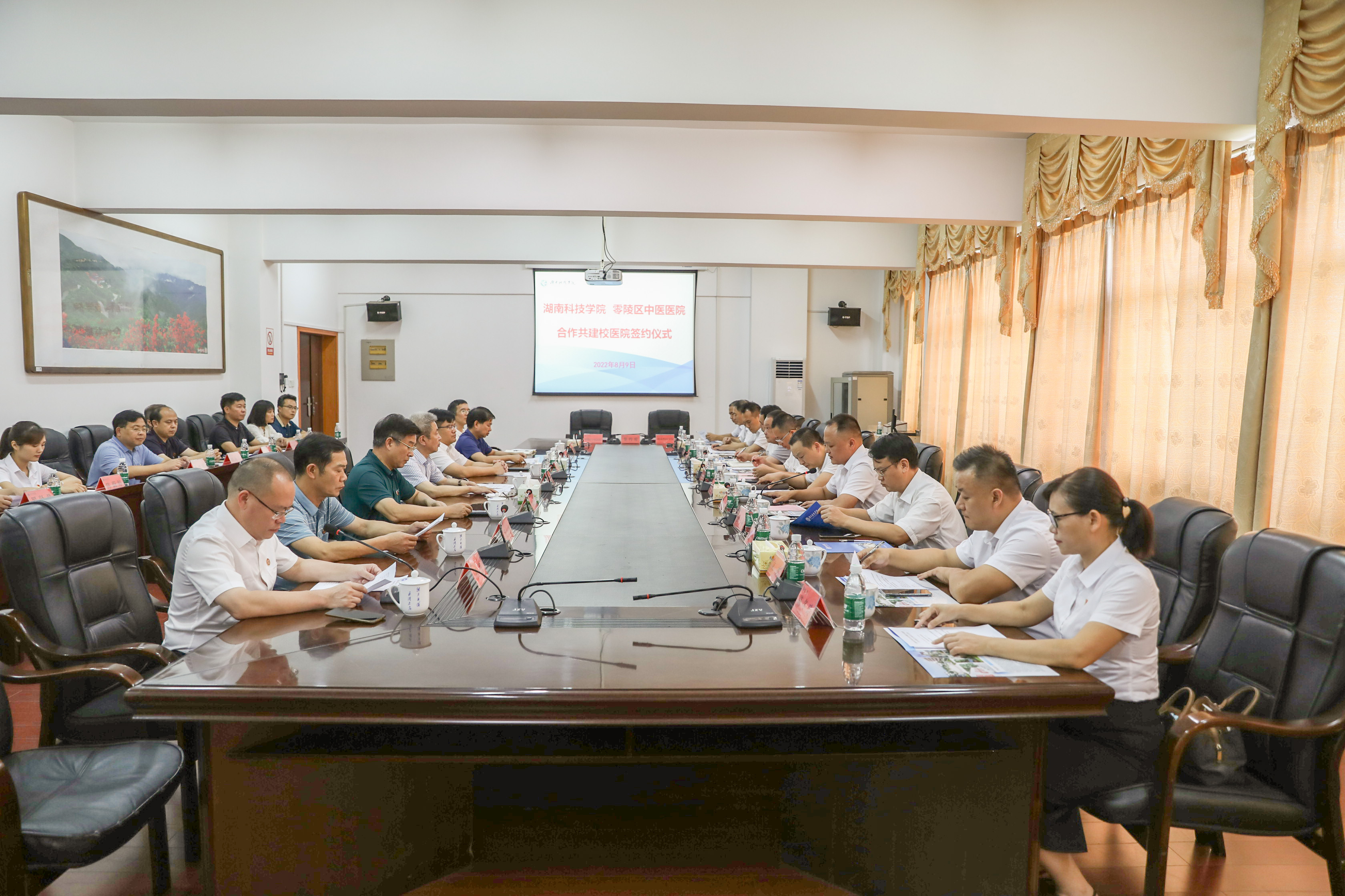 本网讯 8月9日,学校与零陵区中医医院合作共建校医院签约仪式顺利举行。校党委书记曾宝成,零陵区委副书记、区长龙亮、安博站官网登录入口_安博(中国)、零陵区人民政府、区卫生健康局、区中医医院及相关单位部门负责人出席本次签约仪式。