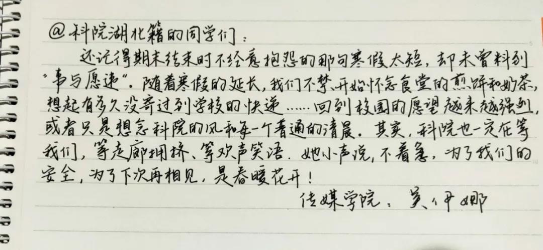 美术与艺术设计学院付星星老师说出了辅导员们的心声,在信中表示:“收到你们一切安好的消息,心里的大石头落地了。有爱,无所畏惧!”信中道不尽的是满心牵挂,经济与管理学院阳子超同学说:“每次,听到有关疫情的最新消息,看到湖北的最新动态,我会想到身处湖北的你们。湖北的同学们,不要忧郁,不要害怕,疫情终会过去,相信不久的一天,我们,会再一次聚集到学校。”传媒学院吴伊娜同学将心意写在信上:“回到校园的愿望越来越强烈,或者只是想念科院的风和每一个普通的清晨。其实,科院也一定在等我们,等走廊拥挤,等欢声笑语。”