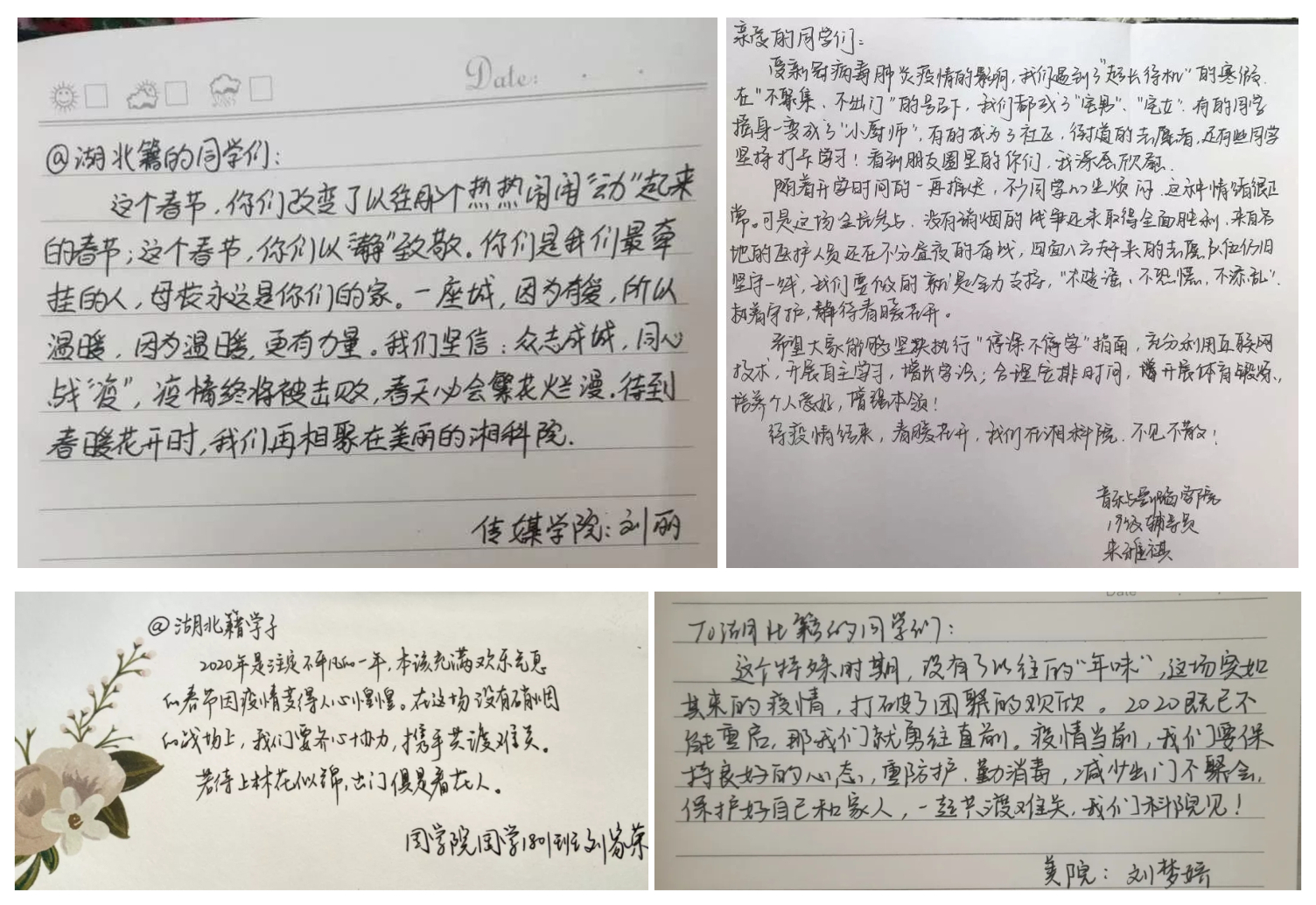 本网讯  “世界很大,幸福很小,希望如期而至的不止春天,还有平安的你们。”“远在千里的你们不会孤单,我们牵挂着你们,等待着你们平安相聚。”连日来,学校师生心系湖北籍的同学们,用书信架起爱的桥梁,用文字传递爱的力量。