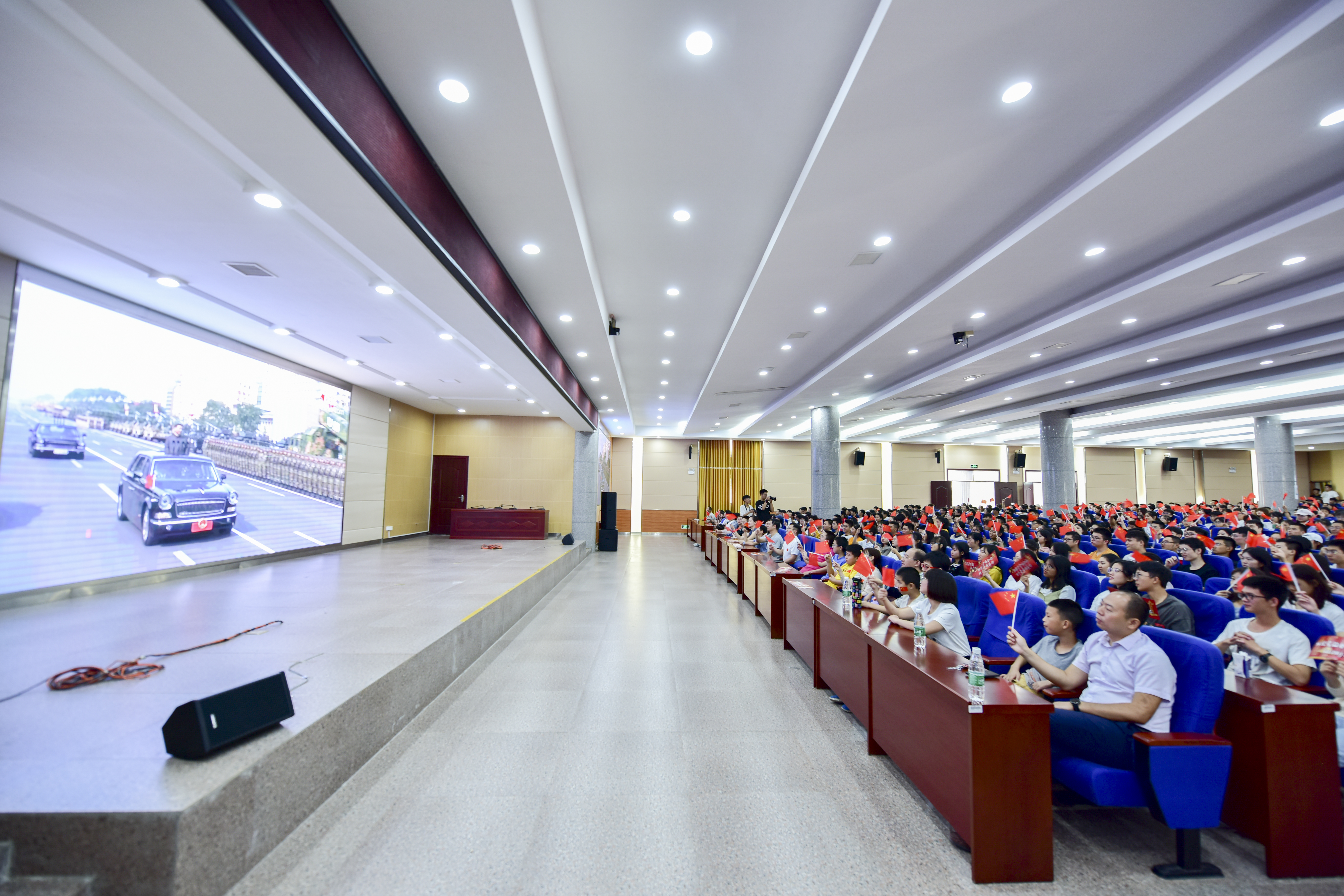本网讯  10月1日,庆祝中华人民共和国成立70周年大会在北京天安门广场隆重举行。中共中央总书记、国家主席、中央军委主席习近平发表重要讲话。庆祝大会后举行盛大的阅兵式和群众游行。学校开放潇湘大讲堂,打开弘毅楼前大屏幕,组织师生集中收看庆祝中华人民共和国成立70周年庆祝大会、阅兵式和群众游行盛况。