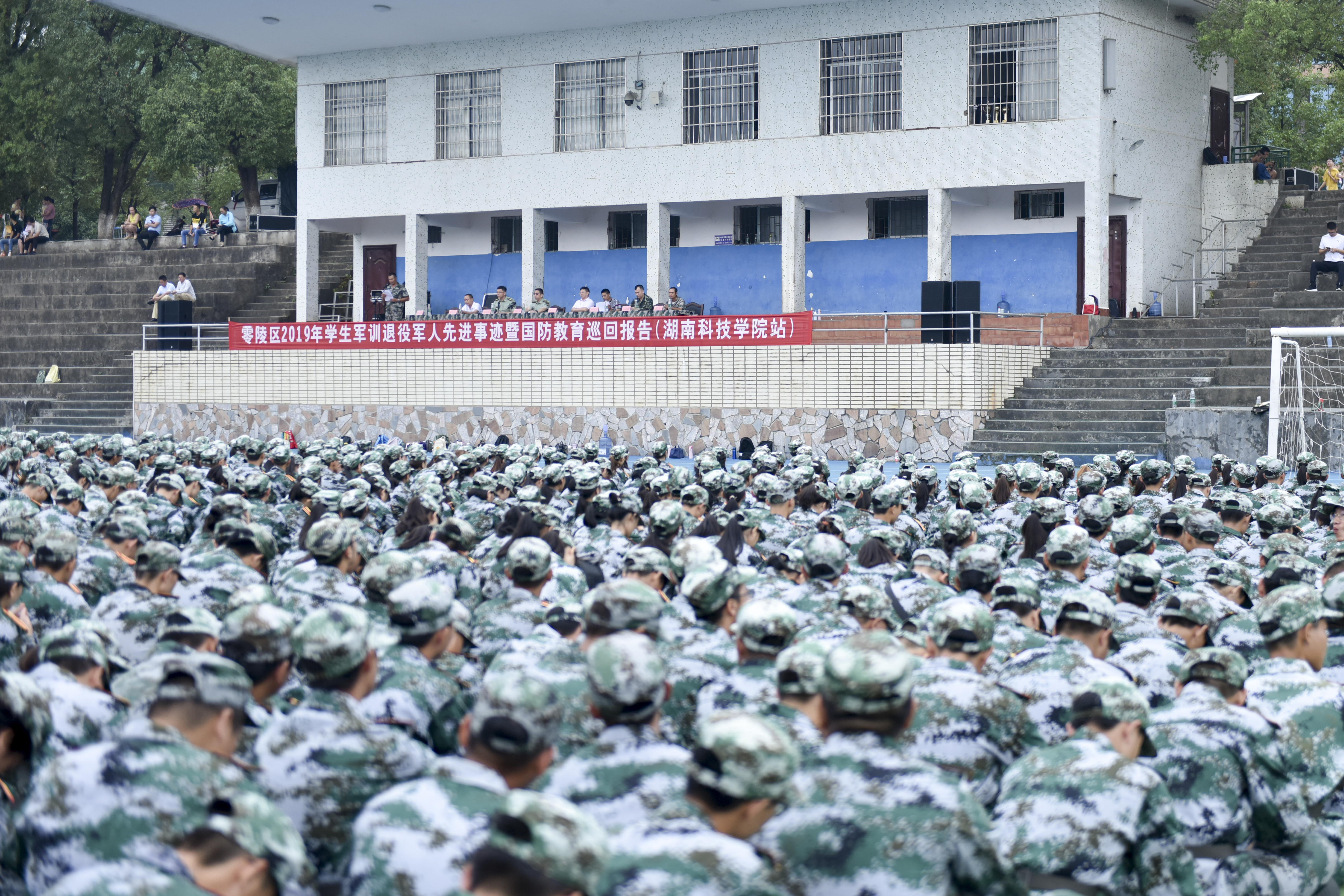 本网讯 9月17日上午,零陵区2019年学生军训退役军人先进事迹暨国防教育巡回报告在学校举行,我校2019级4000余名新生参与活动,在紧张的军训间隙接受了一堂深刻的国防教育课,感受报国情,共筑国防梦。