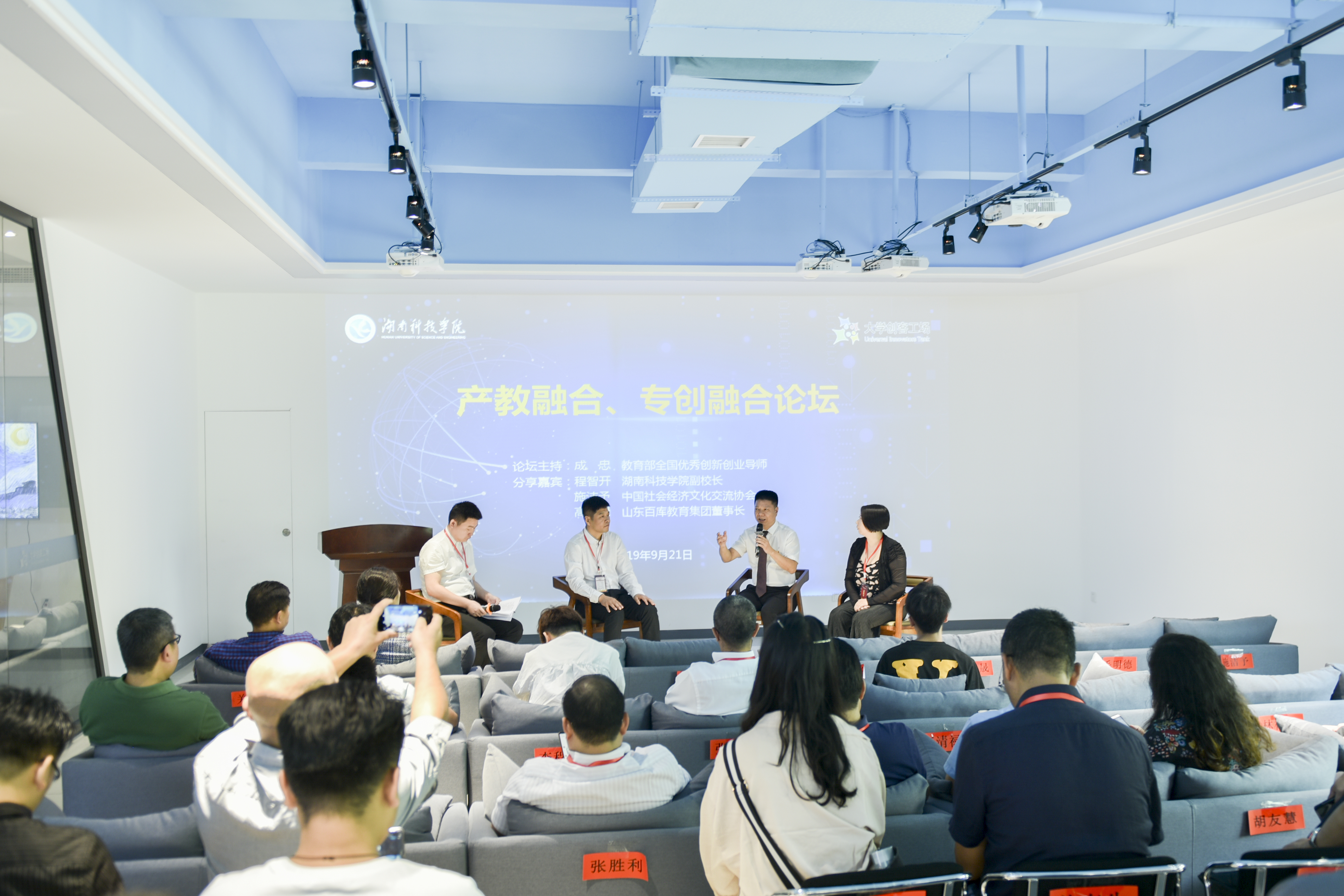 本网讯 9月21日上午,教育部学校规划建设发展中心首家大学创客工场启动仪式暨产教融合专创融合论坛在学校举行。湖南省大中专学校学生信息咨询与就业指导中心副主任夏学军,湖南省科技厅高新处副处长彭子晟,教育部学校规划建设发展中心大学创客工场执行总经理马卉子,中国经济文化交流协会艺术与设计专业委员会副理事长施洁予,副校长李常健,程智开以及同济大学、湖南农业大学等19所省内外高校的专家学者,学校创新创业学院院务委员会成员、教学学院党总支书记以及部分学生代表参加了启动仪式及论坛。