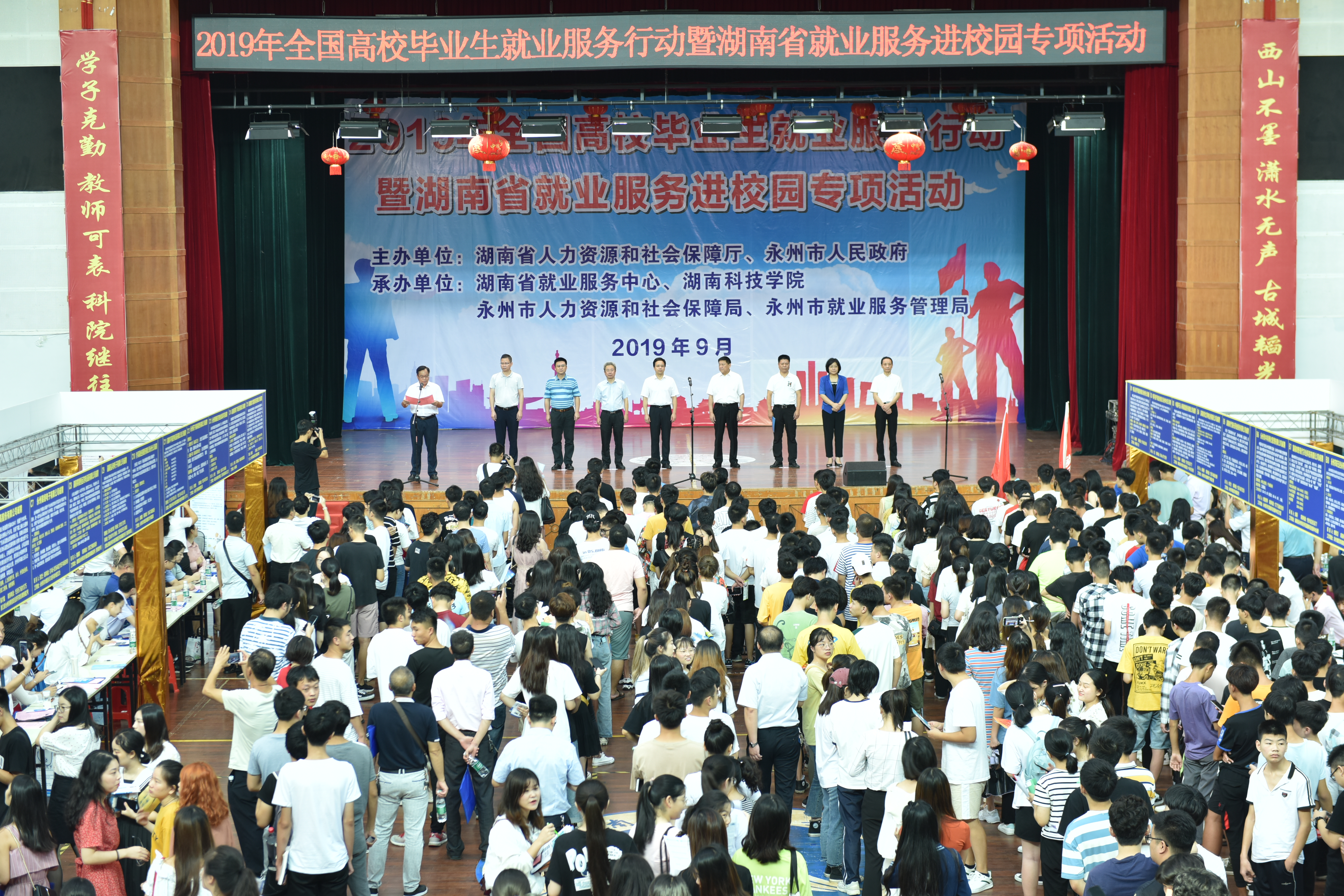 本网讯 9月4日上午,2019年全国高校毕业生就业服务行动暨湖南省“就业服务进校园”专项活动在我校体育馆举行。省就业服务中心党委书记、主任周光明,副市长严兴德,校党委书记曾宝成,副校长程智开以及我校和永州职业技术学院、潇湘技师学院的4000余名毕业生参加活动。