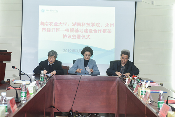本网讯 3月12日下午,学校与湖南农业大学、永州经开区举行合作签约仪式,共同签订了《湖南农业大学和安博站官网登录入口_安博(中国)科技支撑永州经开区植提基地建设合作框架协议》。湖南农科院党委书记柏连阳教授,湖南农业大学曾建国教授,永州经开区党委副书记、管委会主任李瑛,校党委书记、校长曾宝成,副校长宋宏福,化学与生物工程学院负责人和相关学科团队负责人参加仪式。仪式由宋宏福主持。
