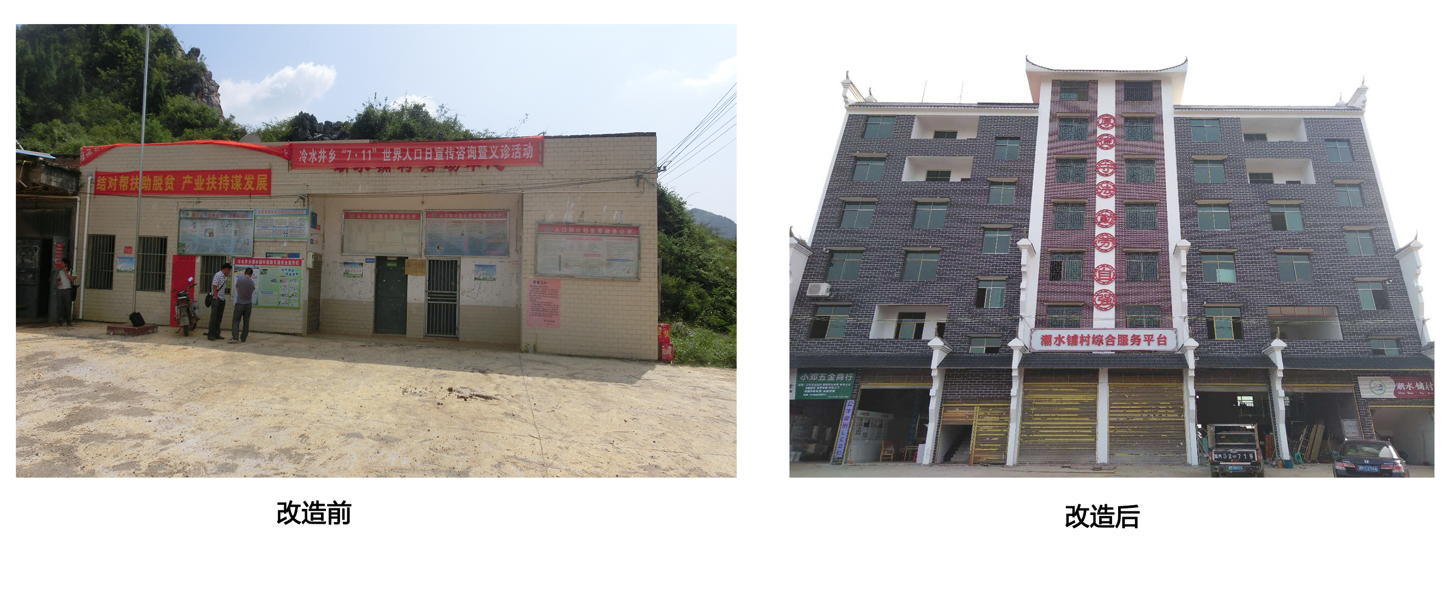 工作队坚持多办事、多解难题、多做好事,他们在工作中深切地感受到要想真正改变一个地方贫穷落后的面貌,必须要改变落后的生产、生活基础设施。在大家共同的努力下,工作队将实事办到群众们的心坎上。目前,主体建筑面积约2700平方米的村综合楼已揭牌;三栋易地搬迁安置房已全部交付使用,农贸市场提级改造已完成;修建水渠2千米,已实现水旱无忧;村、组道路全部实现硬化,对村内重点区域实行沥青路改造,道路两旁建设绿化带;建设高清电子监控系统,完成了平安村庄工程;完成了集中供水工程,使全村通上了自来水;村内农网改造达标后100%农户生产、生活用电符合要求;全村所有道路及重点部位全部安装了共计150盏路灯,房屋外装修的美丽乡村建设试点已初见成效……该村村容村貌和生态环境得到了极大的改善,有效推进了村内基础设施建设及民生工程实施,被评为市级文明卫生示范村,打造成了全省扶贫工作典型示范村,潮水铺村的华丽蜕变成为了美丽乡村建设的一个缩影。