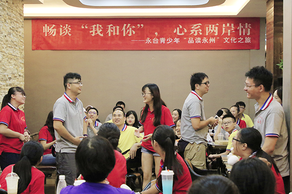 在主题为“畅谈‘我和你’,心系两岸情”的青少年沙龙上,永台青少年欢聚一堂,分别就地方文化及自身未来规划进行了深入热切的交流。在“心有灵犀”游戏环节,同学们分为六组,进行了默契猜词。沙龙现场,大家欢声笑语、其乐融融。