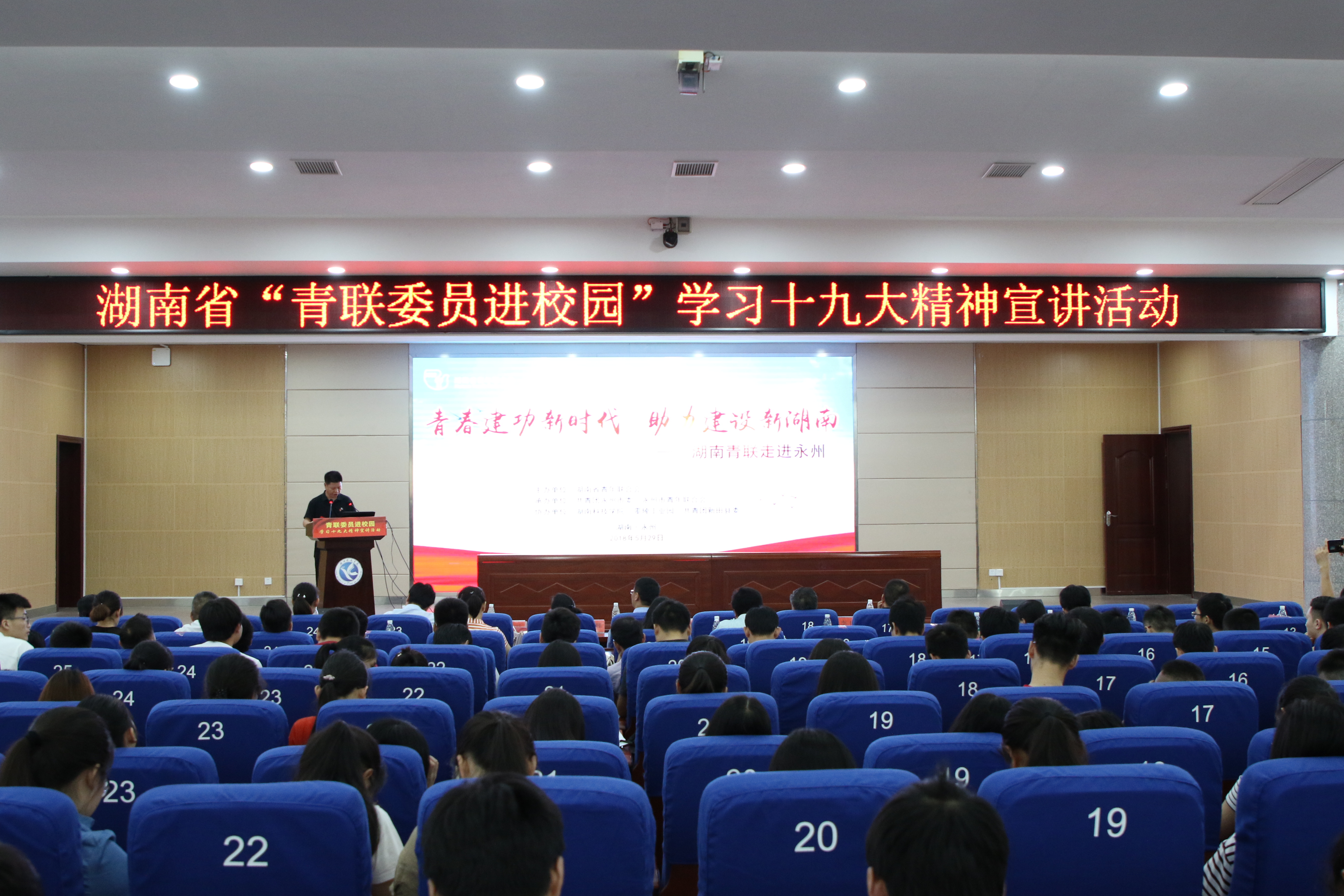 本网讯 5月29日上午,湖南省“青联委员进校园”学习十九大精神宣讲活动在我校潇湘大讲堂举行。共青团湖南省委统战部部长、省青联秘书长李卫锋参加活动,副校长程智开出席,团市委副书记、市青联主席李玲主持宣讲会。