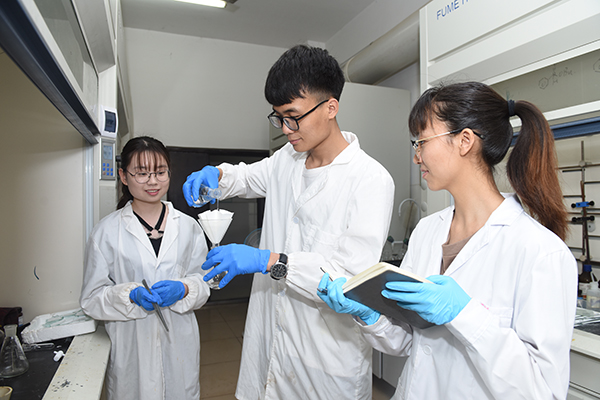 为了得到高产率的酰胺产物,每天一下课,三人就往实验室钻,直到宿舍门禁时间前才匆匆跑回去。有时一整天都耗在实验室里,一边查文献一边做实验,饭也顾不上吃,甚至连期末的复习也都是在实验室完成。实验室、教室、图书馆,三人在三点一线的生活中,为着共同的目标奋力拼搏。“我们每天不是在实验室,就是正在去实验室的路上。”谭家希三人时常自我调侃。而枯燥的重复试验,不期而至的失败,实验室刺鼻的试剂味等压力,都丝毫没有动摇三人的决心。