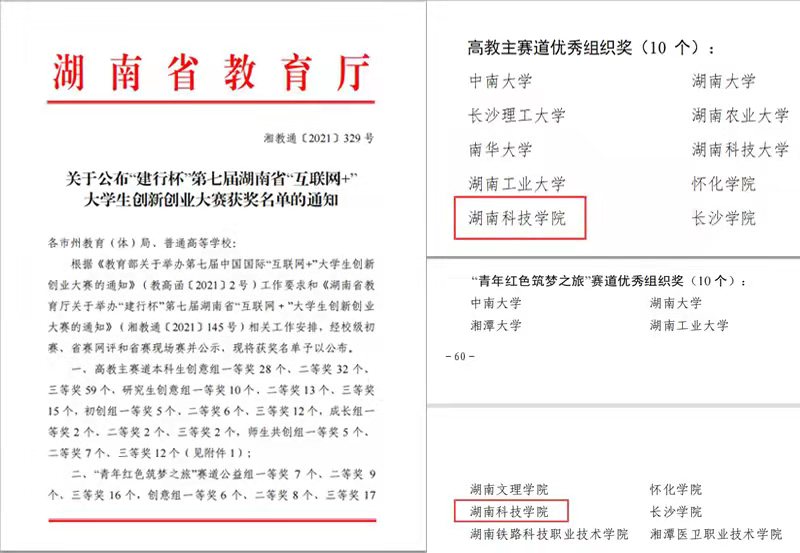 本网讯 (通讯员 周忠夏)近日,省教育厅印发《关于公布“建行杯”第七届湖南省“互联网+”大学生创新创业大赛获奖名单的通知》湘教通〔2021〕329号文件 ,学校首次荣获“高教主赛道”“青年红色筑梦之旅赛道”双赛道两项优秀组织奖。