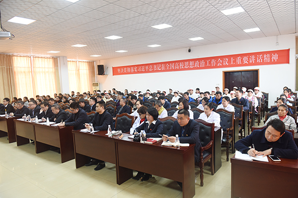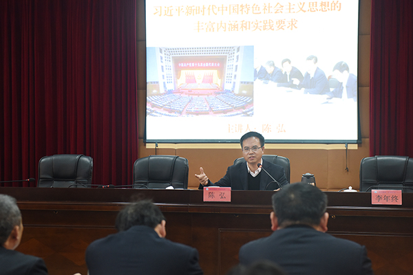 陈弘介绍了党的十九大报告的主要成果,用图文并茂的形式,通俗易懂的语言,宣讲阐释了习近平新时代中国特色社会主义思想关于“坚持党的领导”和“坚持以人民为中心”两个方面的深刻内涵。陈弘结合学校实际,并就如何贯彻落实好“党的领导”和“人民中心”提出四点具体要求:一是要加强党性修养;二是要加强组织监督和群众监督;三是所有同志要认真干好本职工作;四是始终把立德树人作为根本任务和首要职责。
