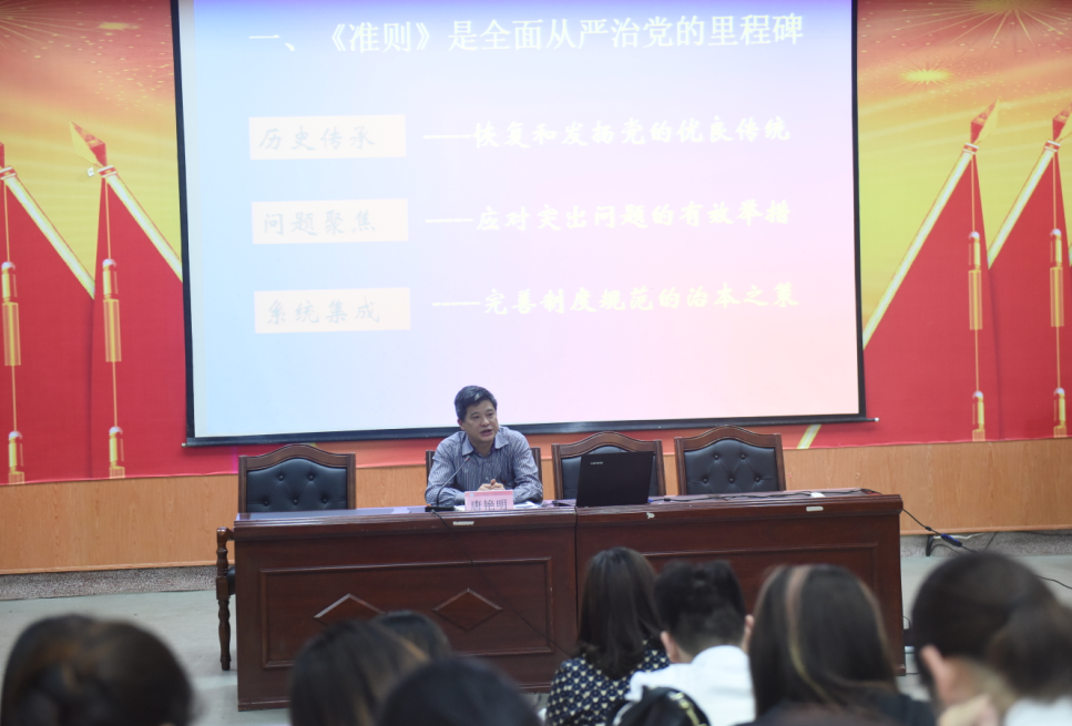 唐艳明以“加强和规范党内政治生活”为主题,从《准则》是全面从严治党的里程碑、全面理解《准则》的重要规定、让《准则》在我校落地生根三个方面对《准则》进行解读并引导学员深入思考。
