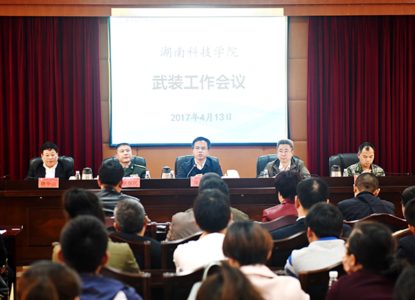 本网讯 413日下午,学校召开武装工作会议,校党委书记陈弘、校长曾宝成,永州军分区参谋长耿保民、零陵区委常委武装部政委蒋诚出席会议。会议由曾宝成主持。
