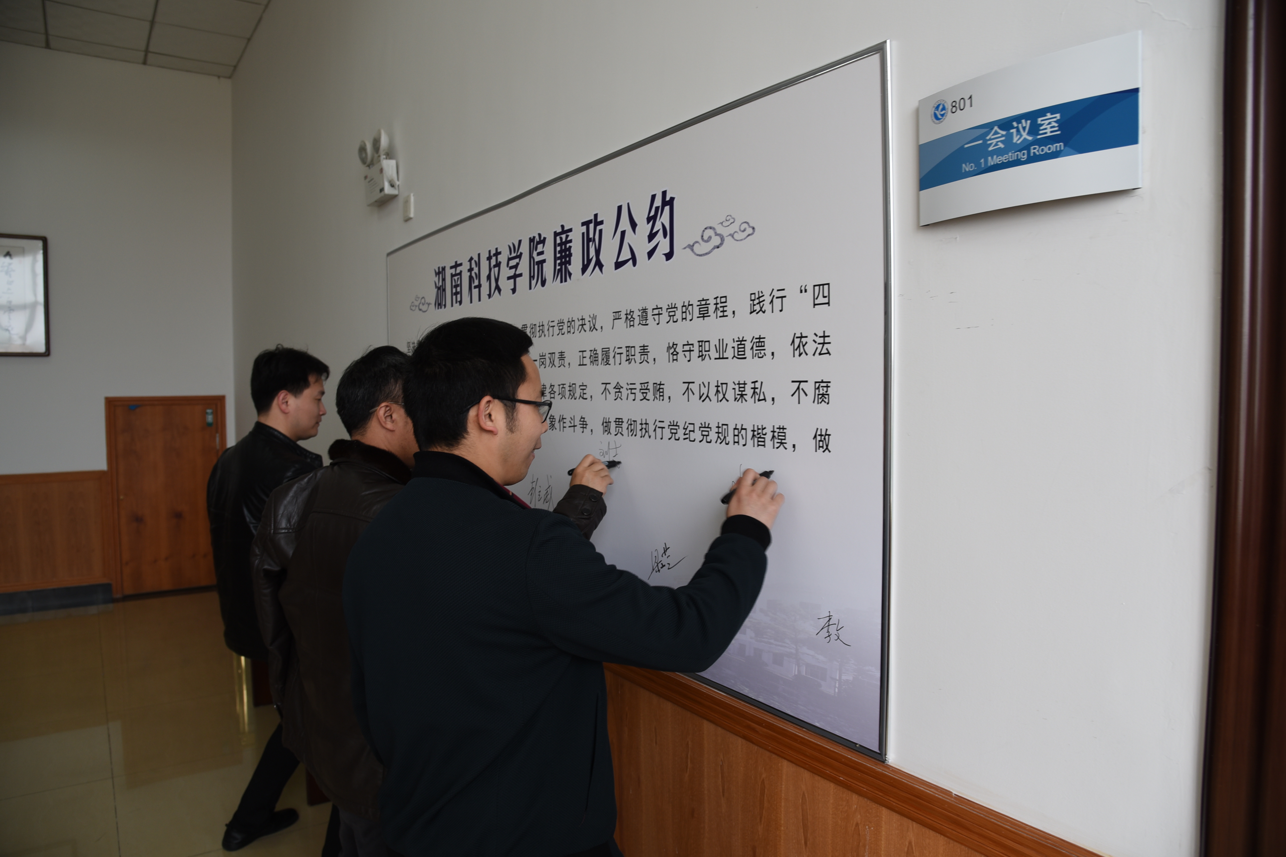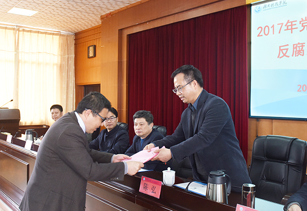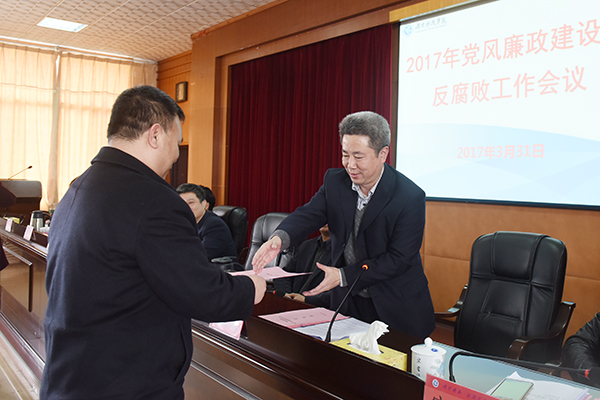 会议正式开始前,全体与会人员开展了《安博站官网登录入口_安博(中国)廉政公约》签名活动。会上,校领导班子成员分别向党委书记陈弘同志签订并递交了《党风廉政建设目标管理责任书》,各二级单位党政负责人分别向分管校领导签订并递交了责任书。