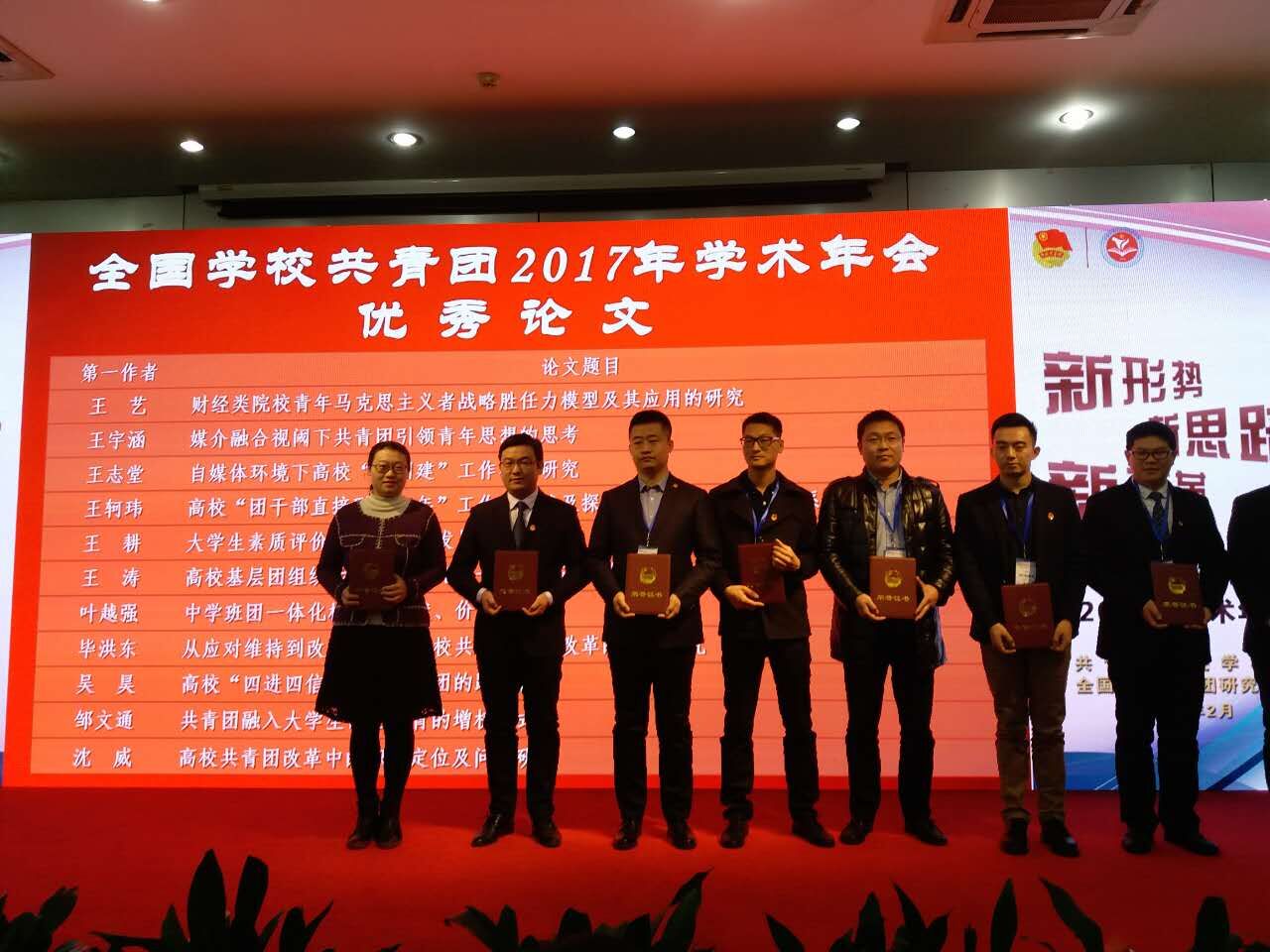 交流环节,王志堂向团中央杜汇良部长汇报了我校共青团工作的经验和特色,得到杜部长的充分赞许。年会期间,主办方举办了主旨报告和优秀论文颁奖仪式。邀请到清华大学林泰教授、中国高等教育学会会长瞿振元教授、北京大学潘维教授、中国人民大学王义桅教授等知名专家学者围绕当前国内政治、经济、教育发展形势做主题报告。王志堂老师提交的《自媒体环境下高校“微团建”工作机制研究》论文荣获年会优秀论文(全国共25篇),并受邀作主题发言,受到与会领导、同仁的一致好评。
