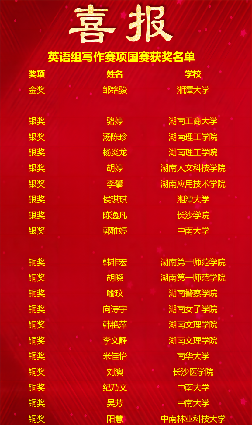 近日,2023“外研社·国才杯”“理解当代中国”全国大学生外语能力大赛英语组国赛落幕,赛事包含了演讲、阅读、写作、笔译、口译五个分项。经激烈角逐,我省高校喜获佳绩,共获得金奖5项,银奖29项,铜奖46项。其中,演讲组获得金奖2项,全国排名第三;阅读组获得金奖1项,全国排名第四;写作组获得金奖1项,全国排名第四;笔译组获得金奖1项,全国排名第八。