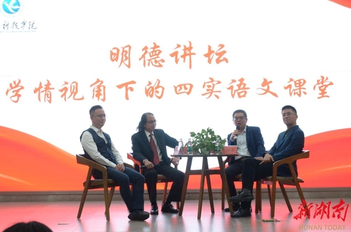 最后进行的是文法学院的经典栏目“明德讲坛——学情视角下的四实语文课堂”,陈铿老师、吴春来老师、刘忠华老师、蒋扬帆老师与现场师生互动交流。大家一致认为,陈铿教授的示范课,很好地体现了“四实”模式要求,坚持将“情境调动 问题驱动 师生互动 工具撬动”四个方面贯穿始终,可学性强,具有良好的示范作用;他的报告,深入浅出、重点突出,具有很强的针对性。