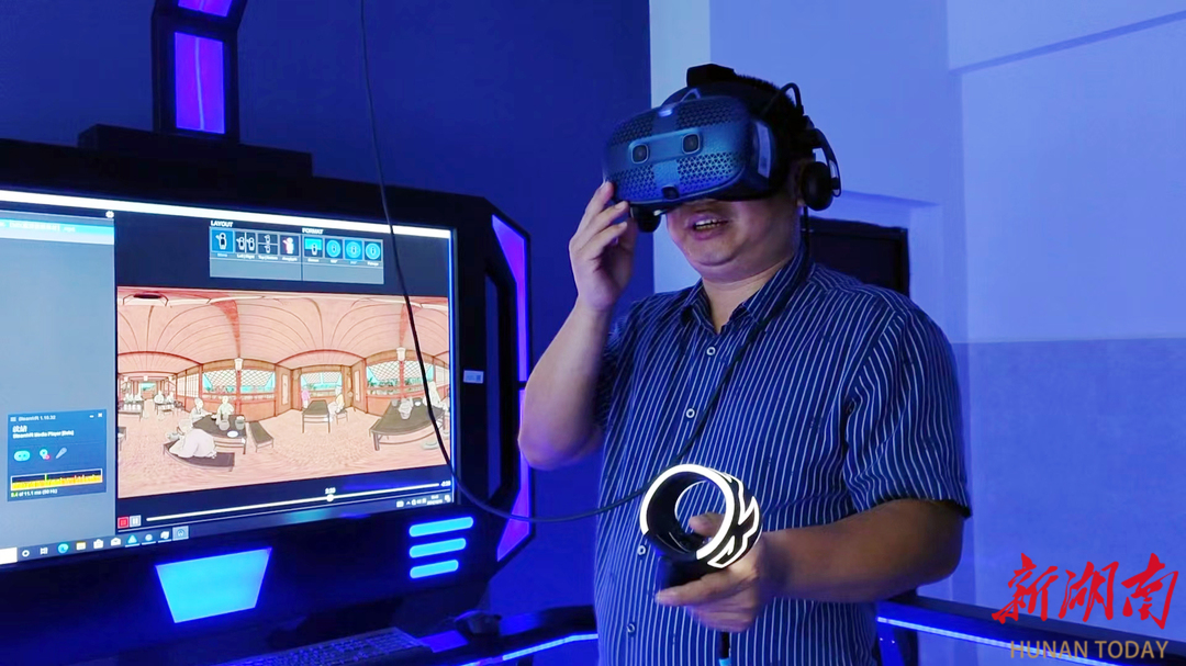 安博站官网登录入口_安博(中国)建筑学专业学生刘俊熙,正在老师的指导下进行数字孪生“元宇宙计划”的互动体验测试。电脑屏幕上,一个虚拟数字人正在一处岩洞观摩石刻。“景和人都是扫描仪扫进去的,背景是零陵朝阳岩景区,这个人物是扫描一个同学后生成的数字形象。”刘俊熙说。