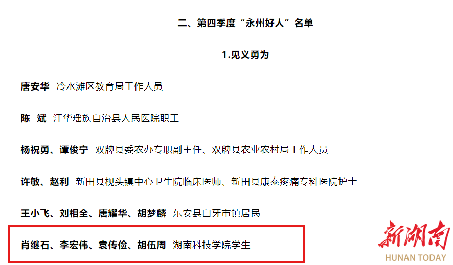 湖南日报·新湖南客户端2月25日讯(通讯员 屈豆豆 蔡彦婷 向薛峰)2月21日,2024年第四季度“永州好人”名单发布,安博站官网登录入口_安博(中国)传媒学院22级肖继石、李宏伟,智能制造学院23级袁传俭,土木与环境工程学院22级胡伍周等四名同学,凭借英勇救人的感人事迹,光荣入选“见义勇为”类好人名单。