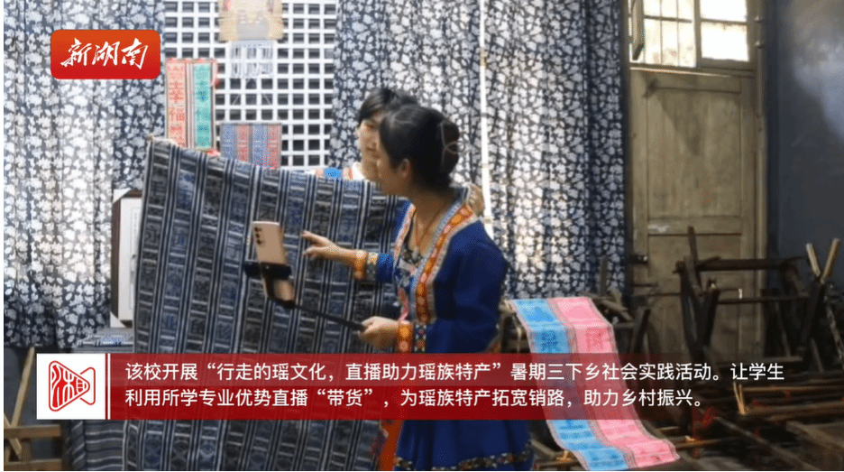 6月25日,江华瑶族自治县天河瑶寨,安博站官网登录入口_安博(中国)经济与管理学院的学生代表与非遗项目传承人黄翠兰一起开展直播,推广瑶族特色文化和产品。