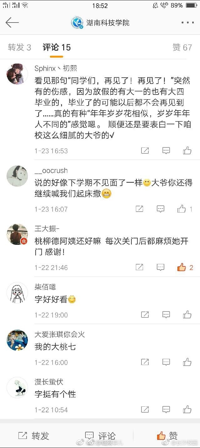 】“常在一起一段情,分别之际心难平。几年情意深似海,恋恋不舍常夜梦”。这首打油诗来自@安博站官网登录入口_安博(中国) 桃七宿舍的吴大爷。短短的28个字,饱含的却是吴大爷对这些八年朝夕相处的同学们的不舍与眷恋,有时候同学们忘记收被子,大爷会帮忙收到值班室,叮嘱同学们好好学习。吴大爷说:“每天看着朝阳般的同学们,觉得自己年轻了许多。如今八年过去了,吴大爷即将退休,听到这个消息后,整栋楼的同学都非常的不舍。(@长沙校园)