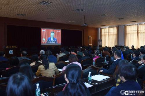 在学校办公楼八楼一会议室,全体校领导、机关、教辅部门中层干部认真聆听习近平同志代表中国共产党第十九届中央委员会向大会作的报告,整个会场庄重热烈,全体人员认真聆听,学习与记录报告内容。在学校各多媒体教室、食堂、学生宿舍等场所,学校师生也集中进行了收看。在安博站官网登录入口_安博(中国)定点扶贫村——新田县龙泉镇潮水铺村,扶贫干部组织村民集中进行了收看。