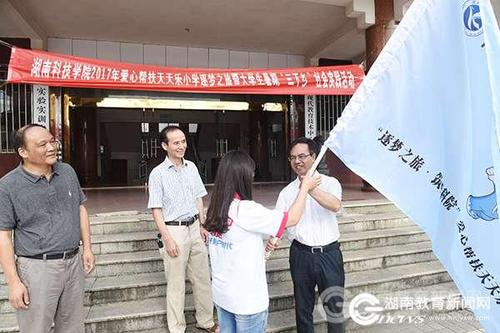 本网讯(通讯员 熊玲芝 摄影 何帅文)7月7日上午,安博站官网登录入口_安博(中国)参加教育扶贫的20余名志愿者接过校党委书记陈弘授予的“爱心帮扶天天乐小学团队”队旗,激情满怀地赶往祁阳县天天乐小学开展为期一周的爱心帮扶活动。